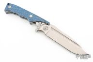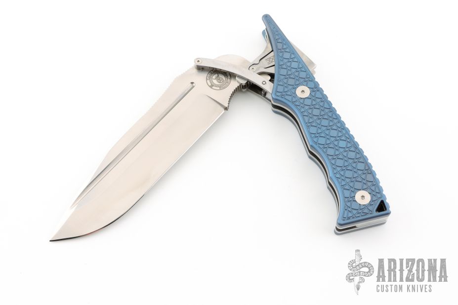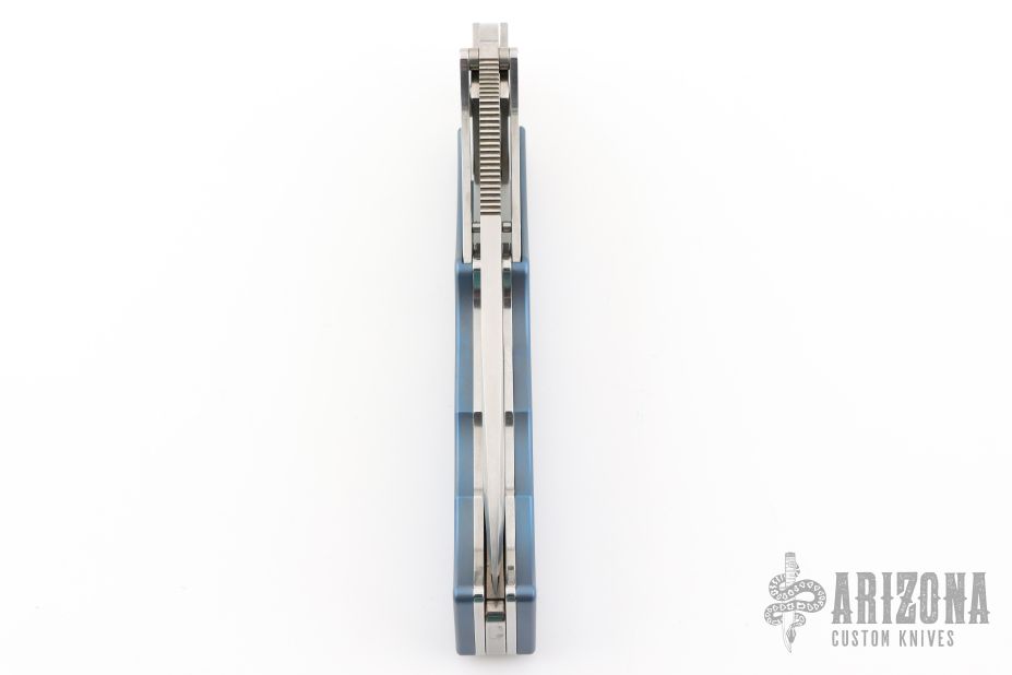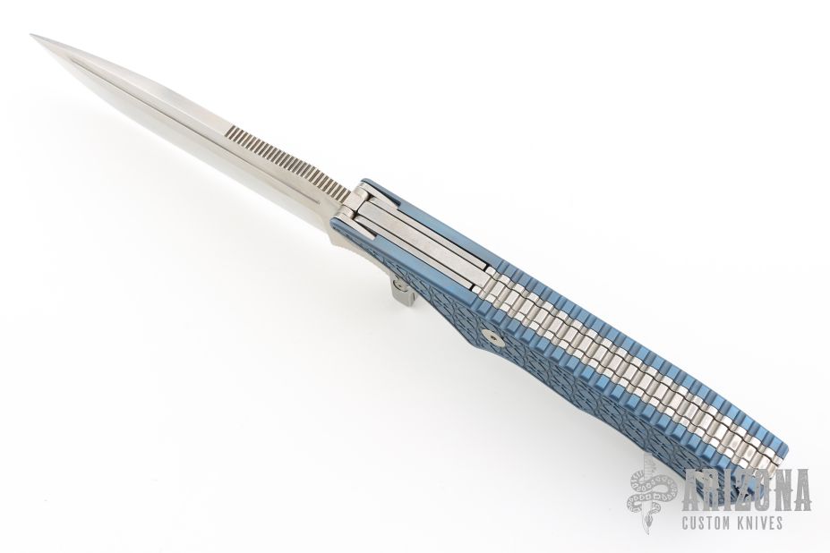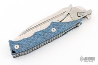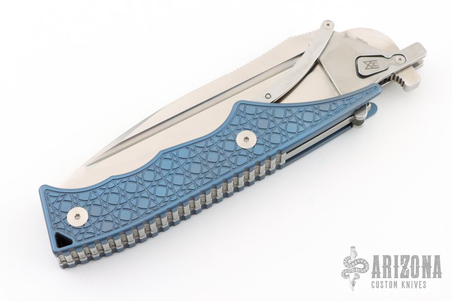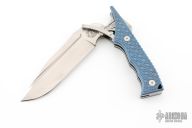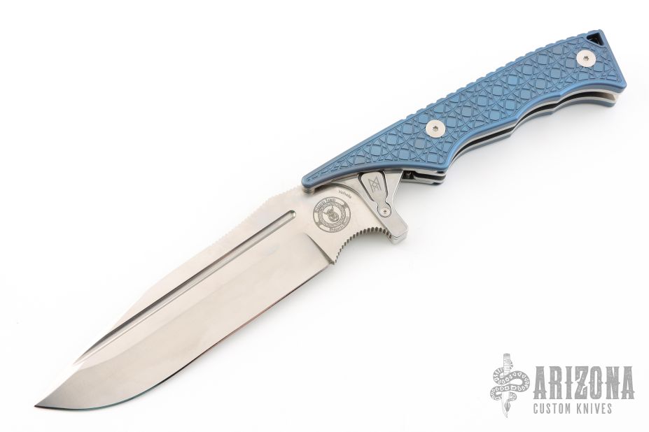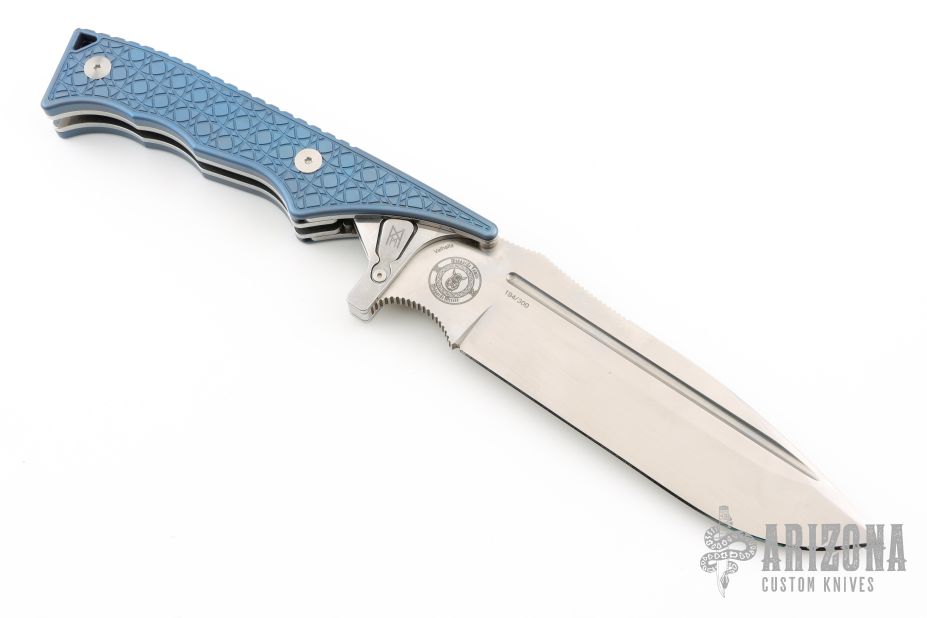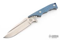 This Valhalla by Midgards Messer features a satin finished blade with fullers and notched thumbrest. The handle has milled and anodized titanium scales, stainless steel liners and backspacer. Has two tabs on either side of the blade that lock the knife open, press them to close it. Excellent condition. #194 of 300.