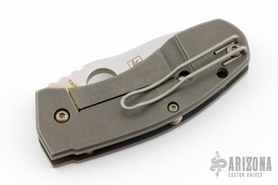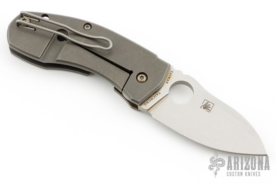 This Techno from Spyderco features a tumble finish blade with thumb hole. Tumble finish titanium frame with titanium posts. This model is now discontinued. Has a couple light scratches, otherwise Excellent Condition.