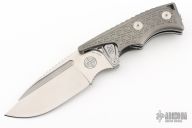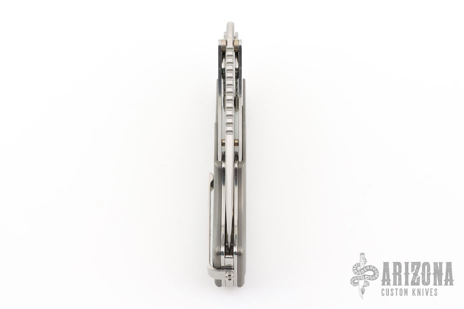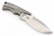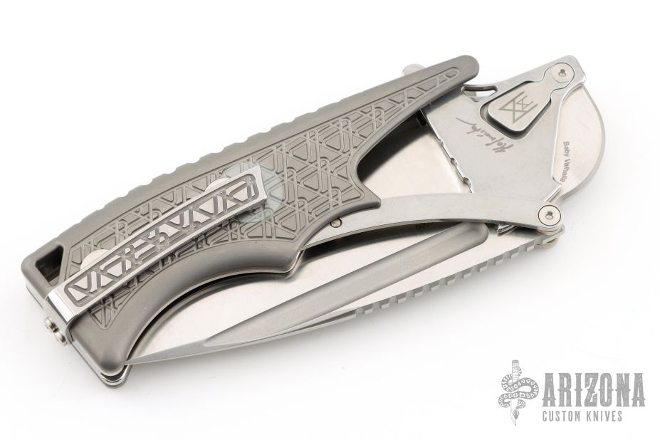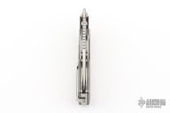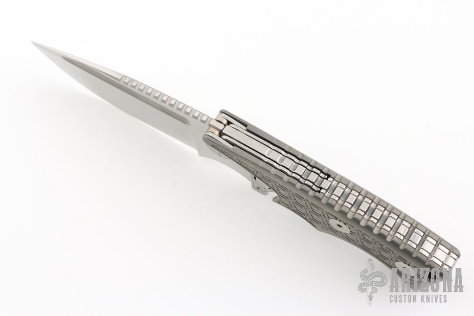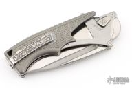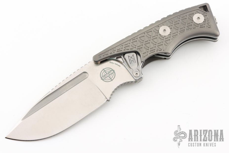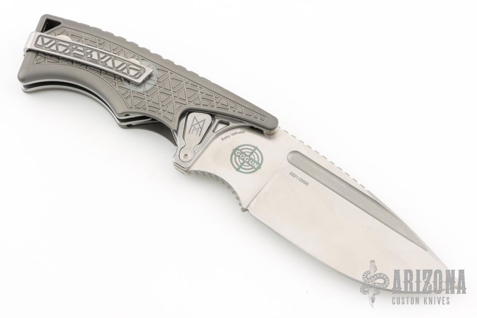 This Valhalla by Midgards Messer features a satin finished blade with fullers and notched thumbrest. The handle has milled and blasted titanium scales, stainless steel liners and backspacer, tip up stainless steel clip. Has two tabs on either side of the blade that lock the knife open, press them to close it. Excellent condition. #0321 of 2000