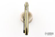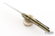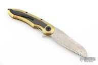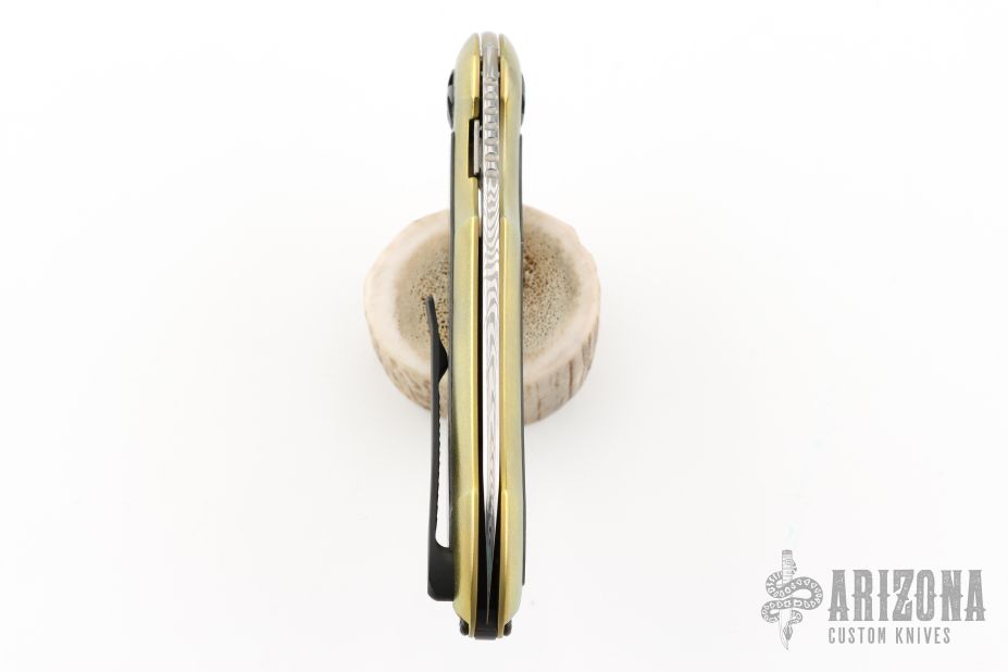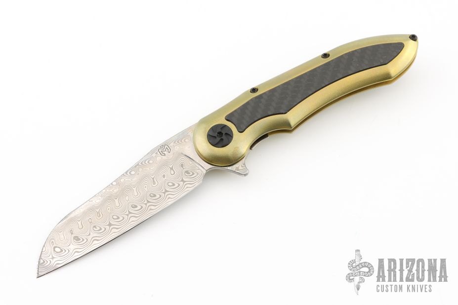 This Max Evo "Yellow Jacket" flipper by Millit Knives features a Damasteel blade with flipper and notched thumbrest. The handle has an anodized titanium frame with carbon fiber inlays, single titanium liner, black titanium backspacer, and a tip up black titanium clip with hidden screws, has black hardware. Rides on bearings. Nice detent, lockup and blade seating. Excellent condition.