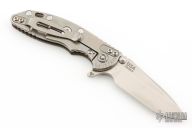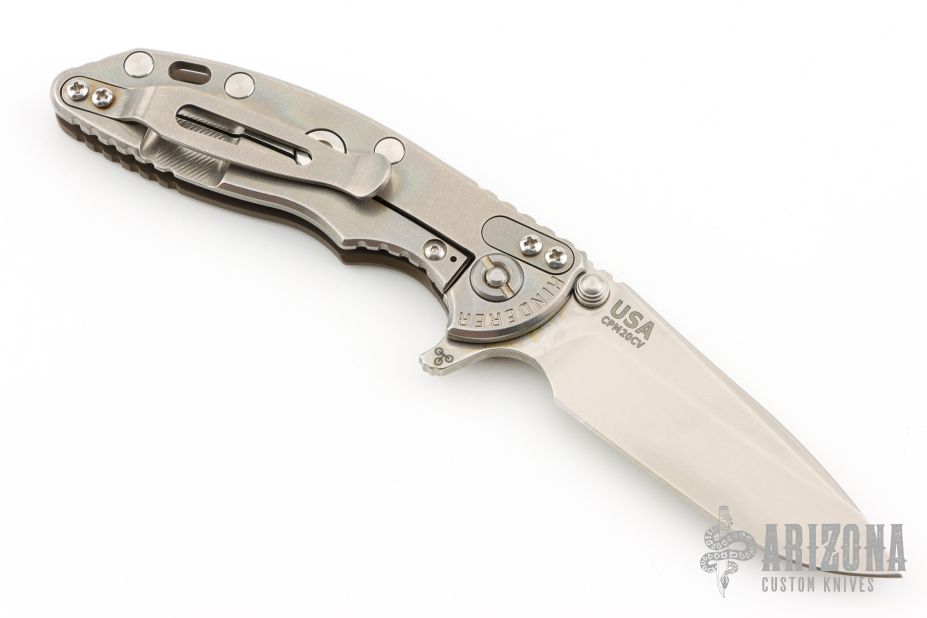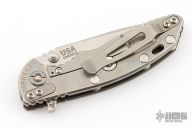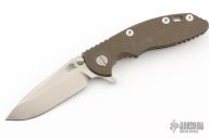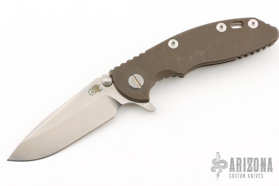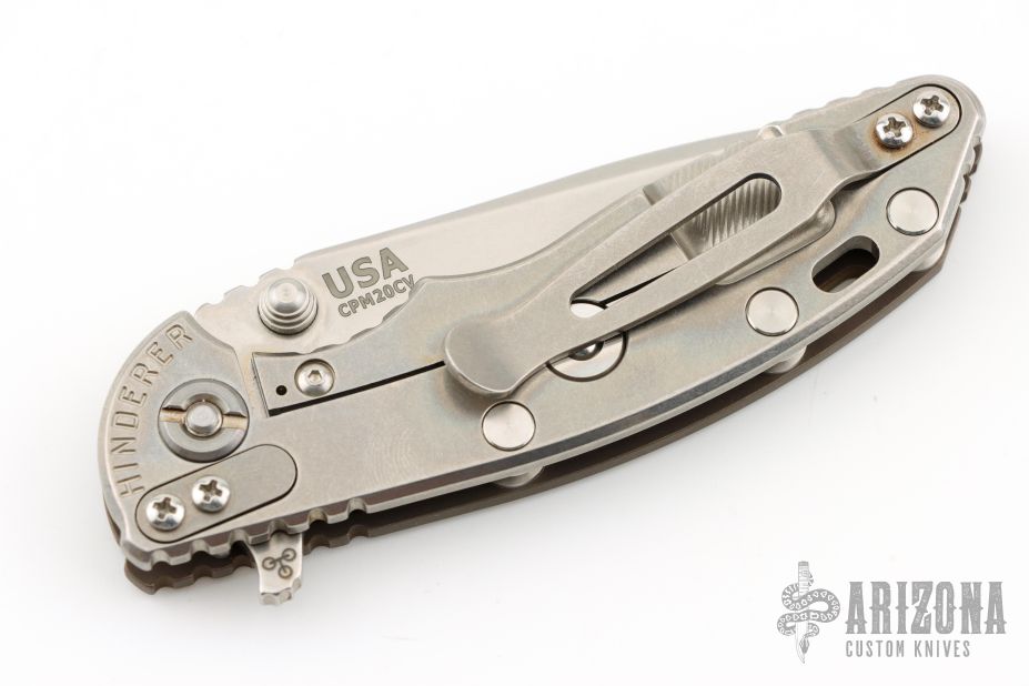 This 3" Slicer XM-18 flipper from Hinderer Knives has a stonewashed blade with notched thumbrest and flipper, no choil. The handle has a bronze stonewashed titanium front scale, a stonewashed titanium frame and clip. Reversible pocket clip. Strong lock up, nice detent and blade seating is center. Has some scuffs, otherwise excellent condition.