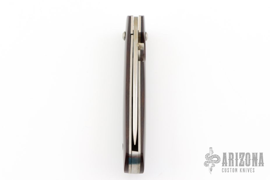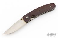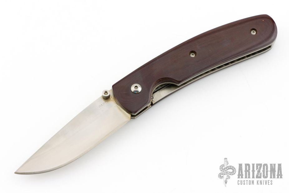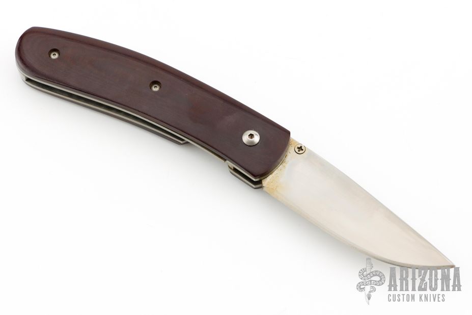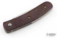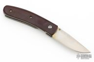 This linerlock by Mel Pardue features a hand rub satin finished blade with single thumbstud. The handle has maroon linen micarta scales, titanium liners and stainless steel backspacer. Nice detent, lockup and blade seating. Has some scratches, and patina. Great condition otherwise.