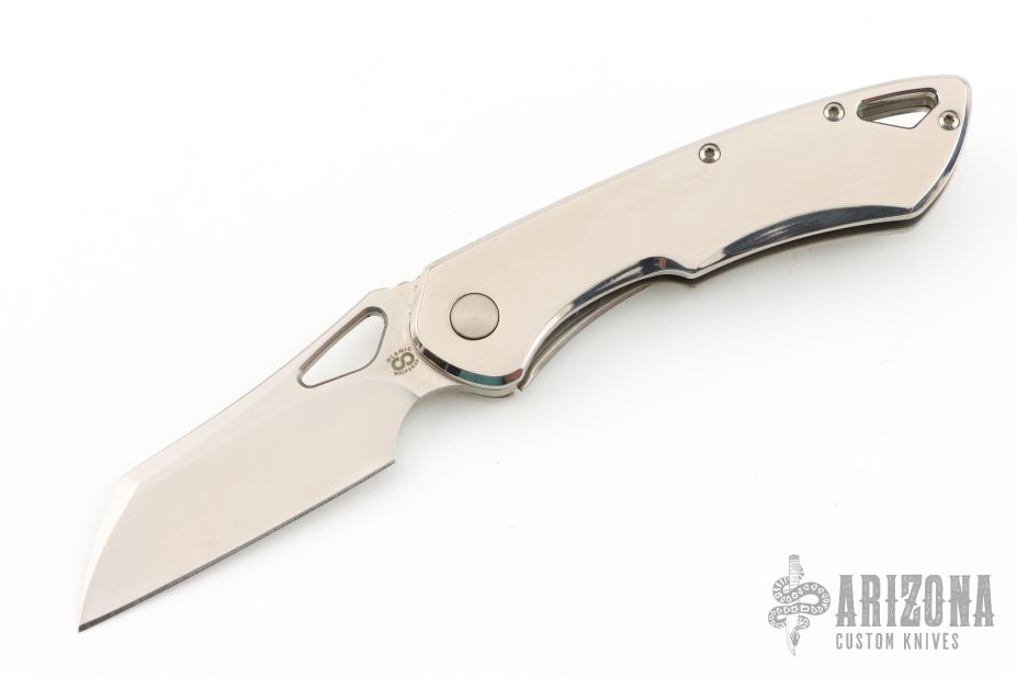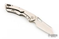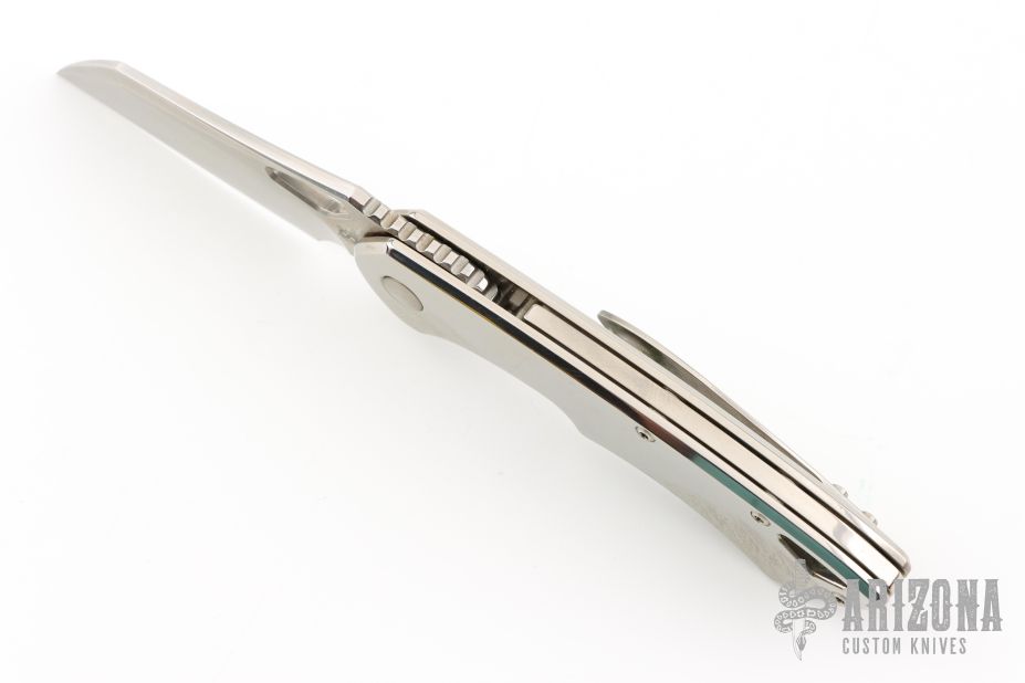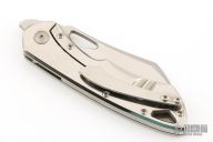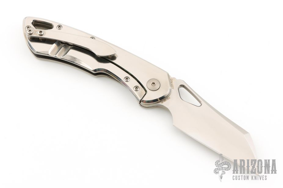 This Whippersnapper from Olamic Cutlery features a satin finished blade, thumbhole, notched thumbrest and front flipper. The handle has a polished titanium frame titanium pocket clip is positioned for tip up carry, floating titanium backspacer.  Comes with COA dated 2/25/2020 and #186W. Has a few light scratches, otherwise excellent condition.