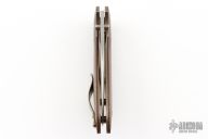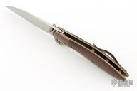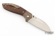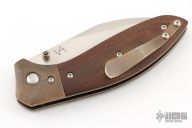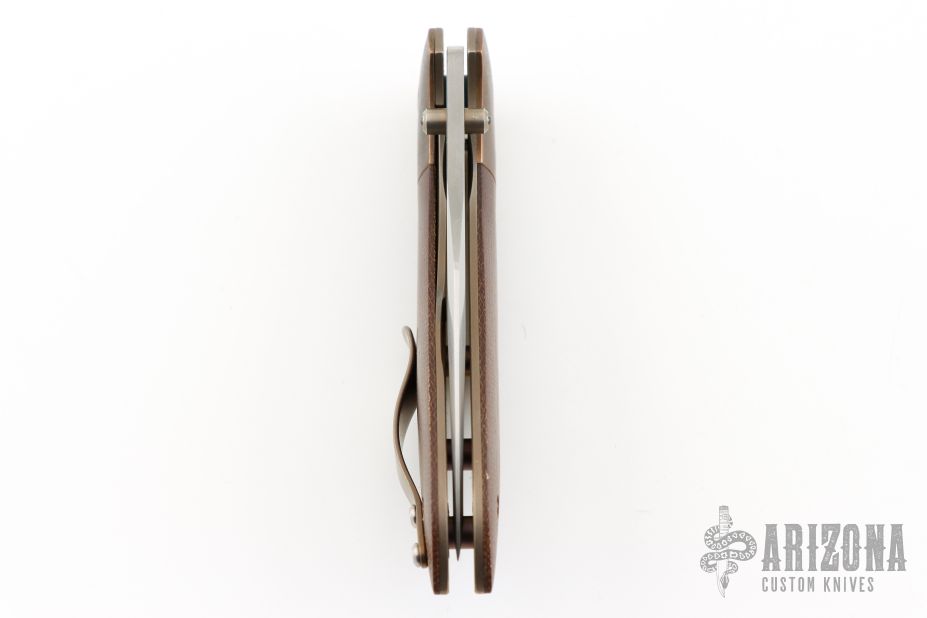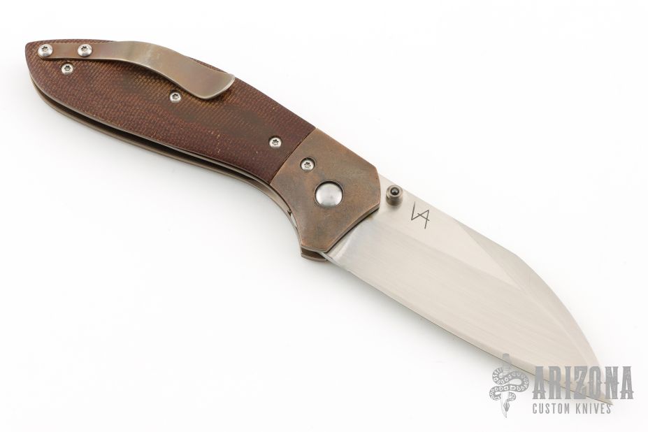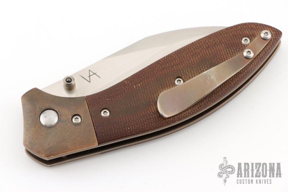 This Mini Odin by Simon V Anderson features a hand rub satin finished sheepsfoot/wharncliffe blade with dual thumbstuds with ceramic ball inlays. The handle has orange peel finished bronze bolsters, anodized titanium liners, brown canvas micarta scales, tip up anodized titanium clip. Nice detent, lockup and blade seating. Has some light scuffs, otherwise excellent condition.