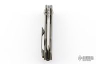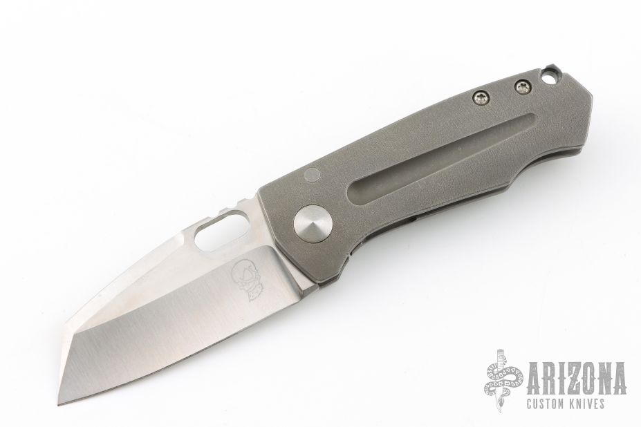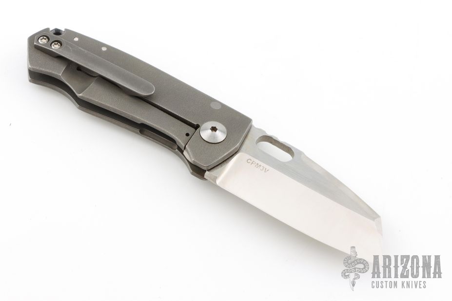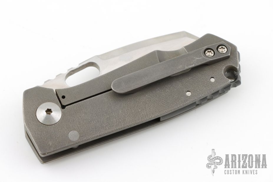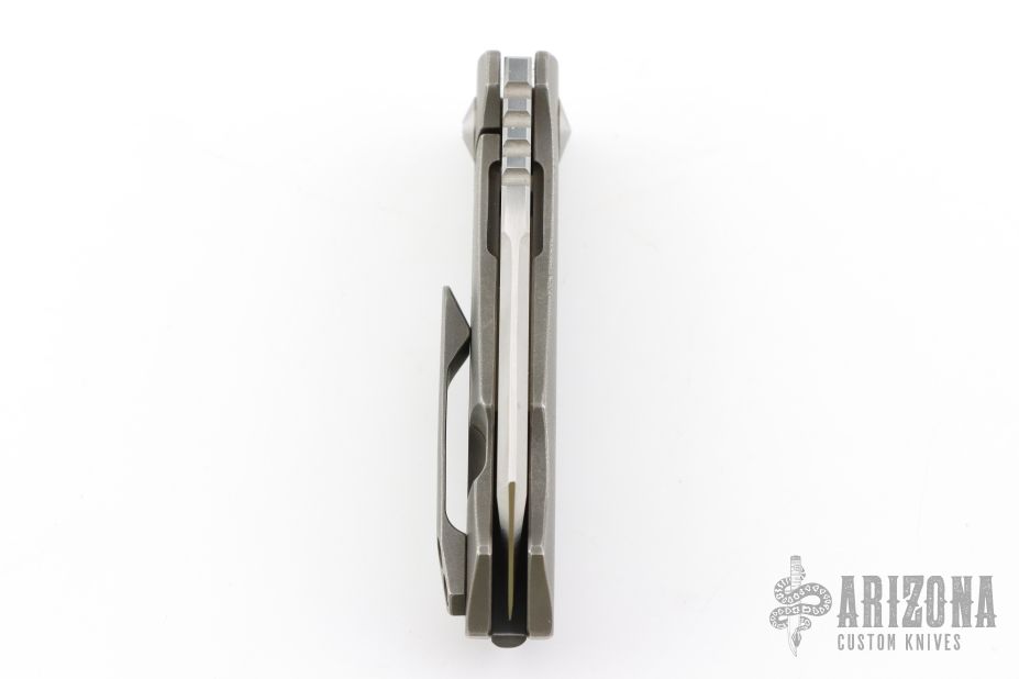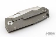 This Folder from Steve Karroll features a satin finished blade, notched thumbrest, and thumbhole. The handle has a tumble finished titanium frame with a titanium clip positioned for tip up carry. It has nice detent, blade seating and lockup. Notched zirconium backstrap. Has some scratches on the body and clip. Great overall condition.