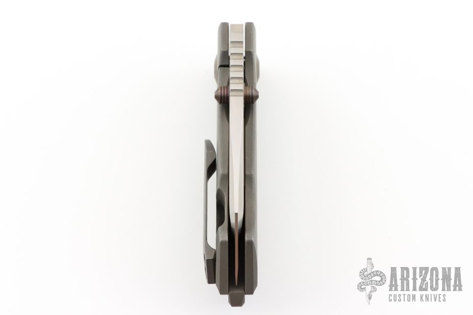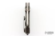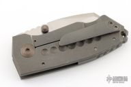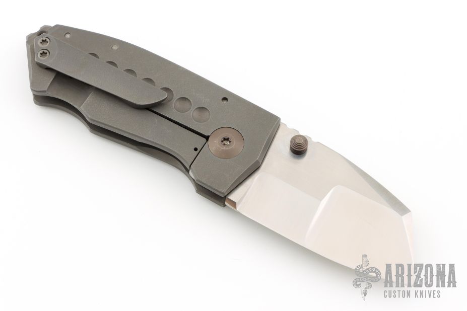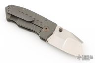 This "Fatty" framelock folder from Steven Karroll features a satin finished blade with notched thumbrest and dual thumbstuds. The handle has a thick orange peel finished and tumbled titanium frame with matching backspacer and titanium clip, positioned for tip-up carry. Nice detent, lockup and blade seating. Has some light scuffs, otherwise excellent condition.