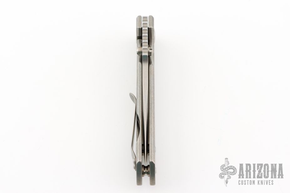 This midtech VECP tanto framelock folder from Les George features a tumble finished, CNC flat ground blade and a bead blasted titanium frame with a matching clip that is positioned for tip up carry. Hinderer lock bar stabilizer. Phosphorus bronze washers. Smooth action. Great blade seating and lockup. Excellent condition.