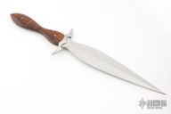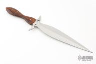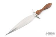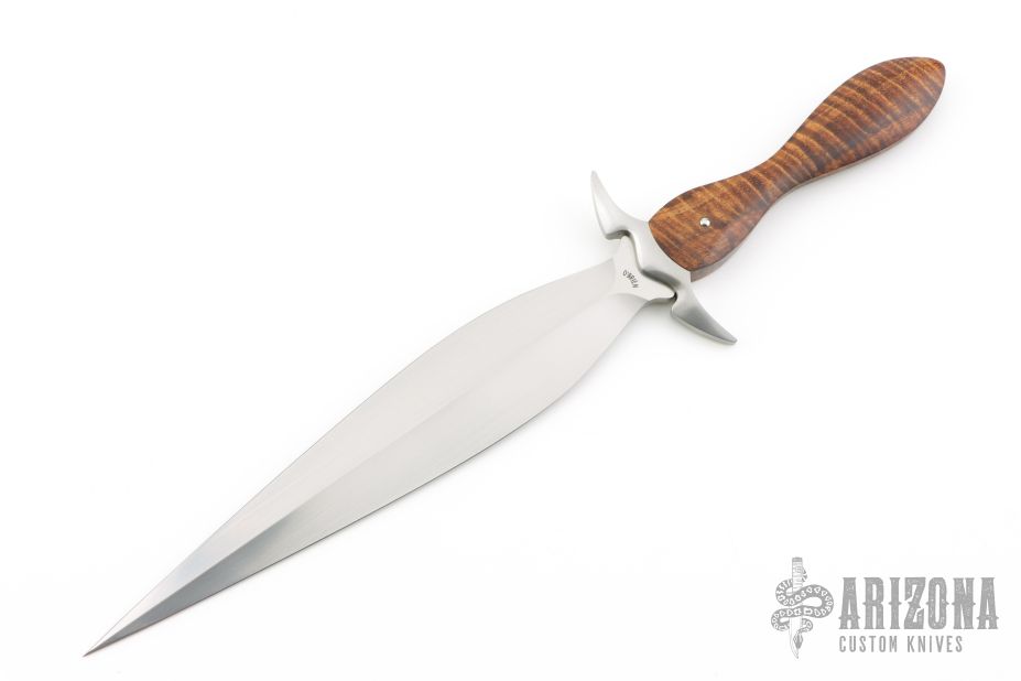 This Model 26 dagger by Mike J O'Brien features a hand rubbed satin finished double edged hollow ground blade, .158" blade stock and 1.435" blade depth, mortised tang construction with 416 stainless steel tang pin. The handle has a satin 416 stainless steel double guard, and curly koa wood grip.  Excellent condition.