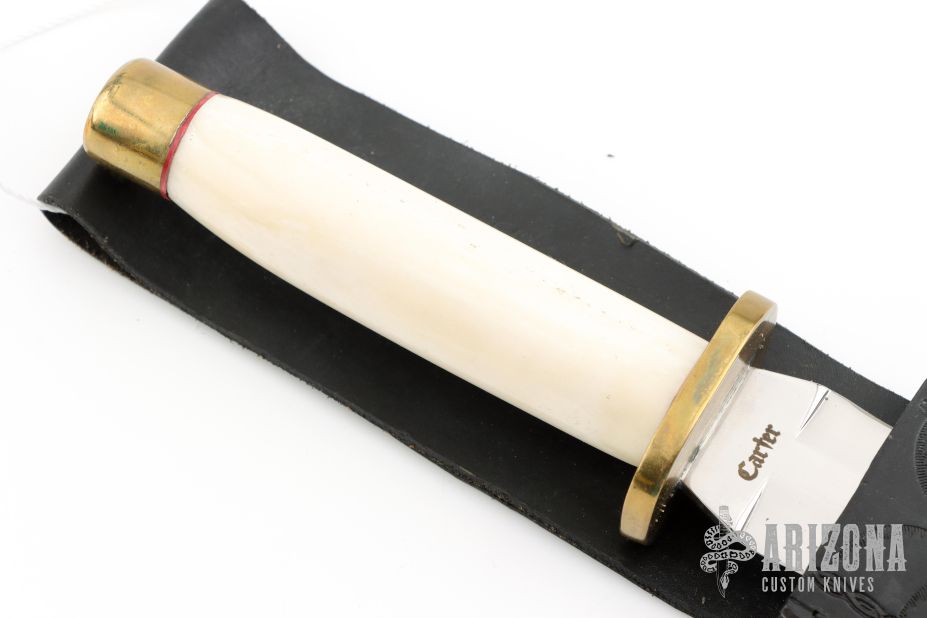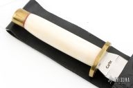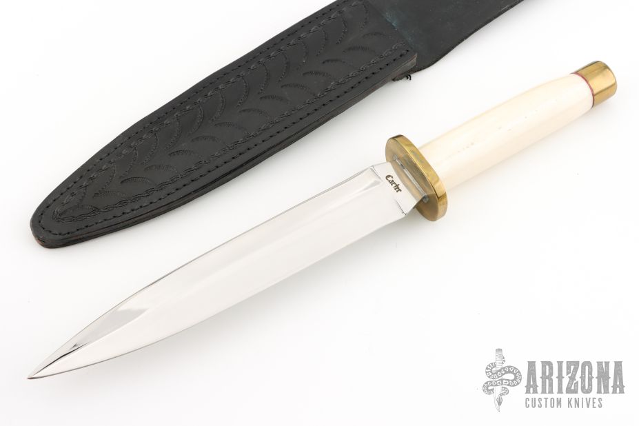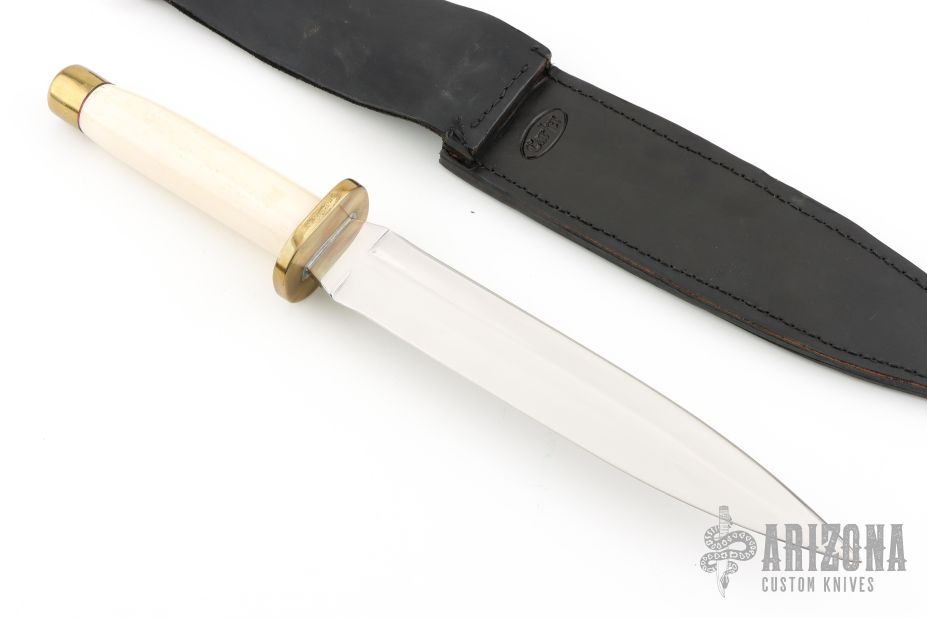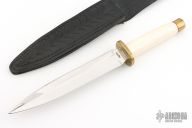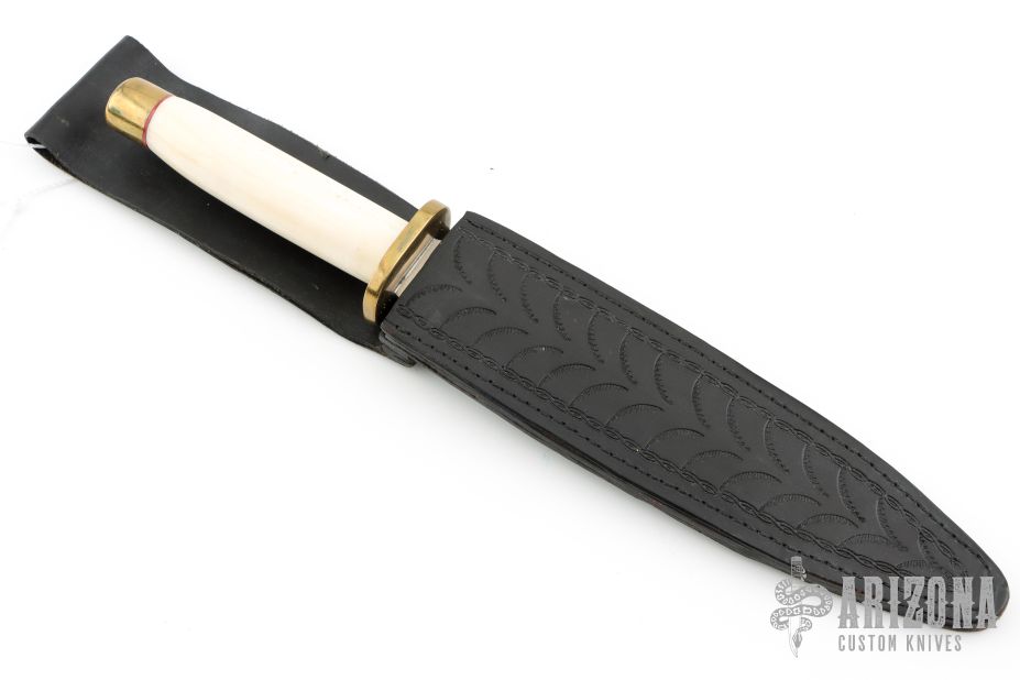 This knife features a mirror polished dagger style blade with a hidden tang construction.  .187" Blade Stock.  1.487" Blade Depth.  The handle has a brass guard and butt cap with a camel bone grip. Includes a black leather sheath.  Excellent Condition.