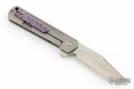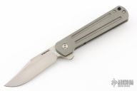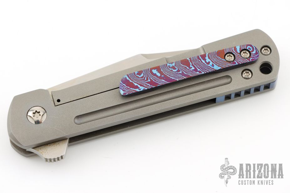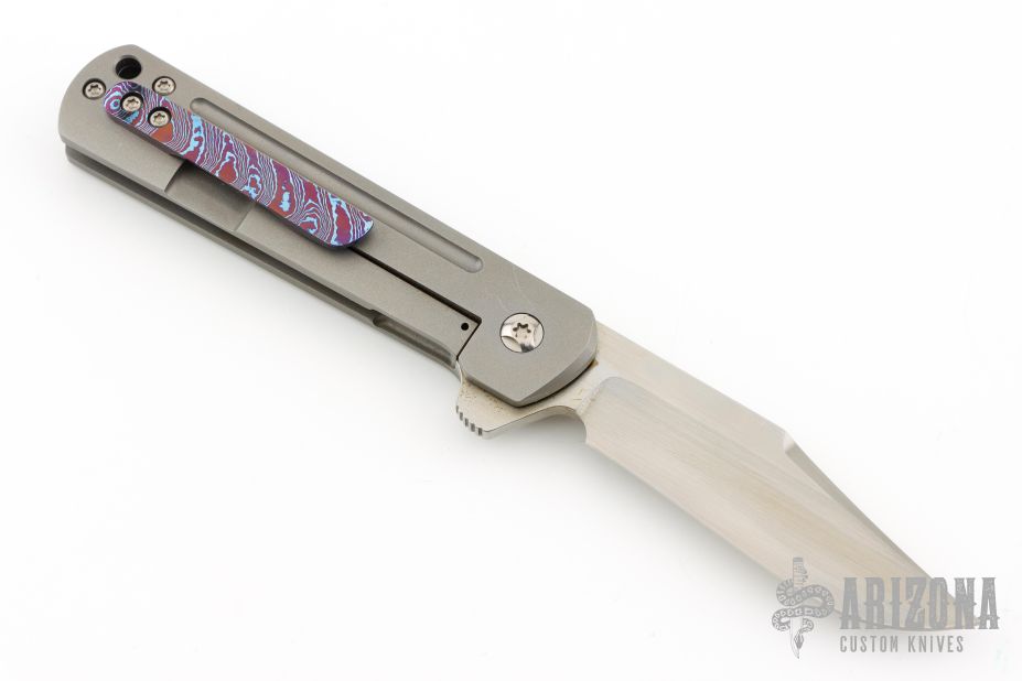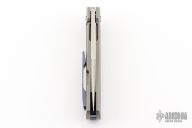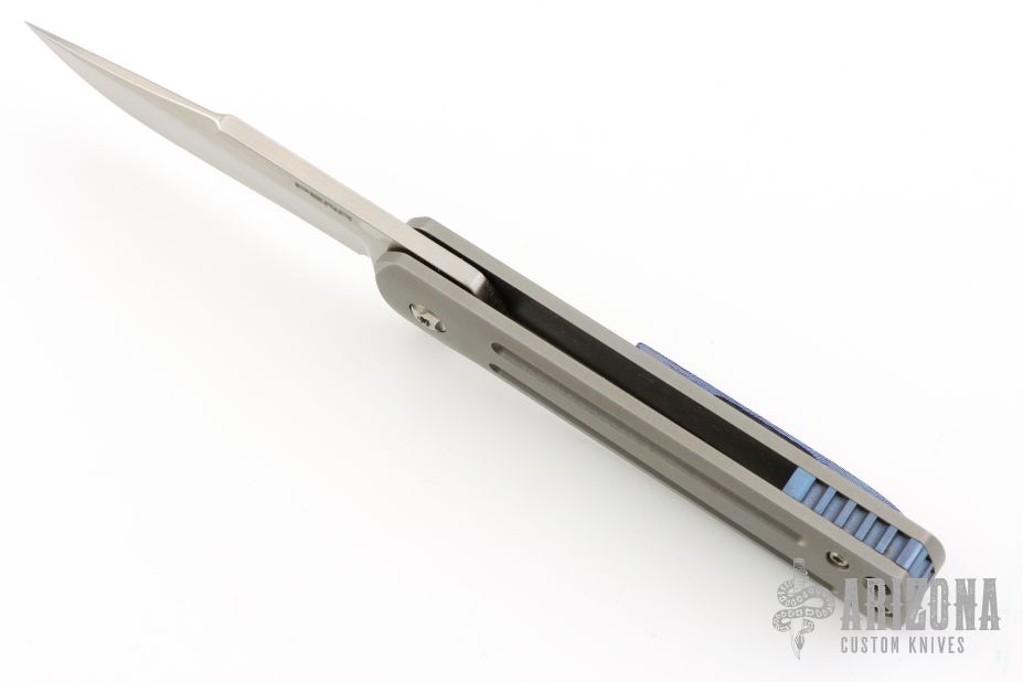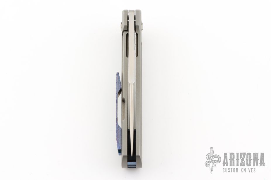 This Barlow flipper from Enrique Pena features a hand rubbed, satin finished blade with swedge and notched flipper. The handle has a bead blasted titanium frame with fullers, blue anodized backspacer and a mokuti clip that is positioned for tip up carry. Nice detent, lockup and blade seating. Has some scuffs, otherwise excellent condition.