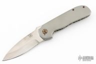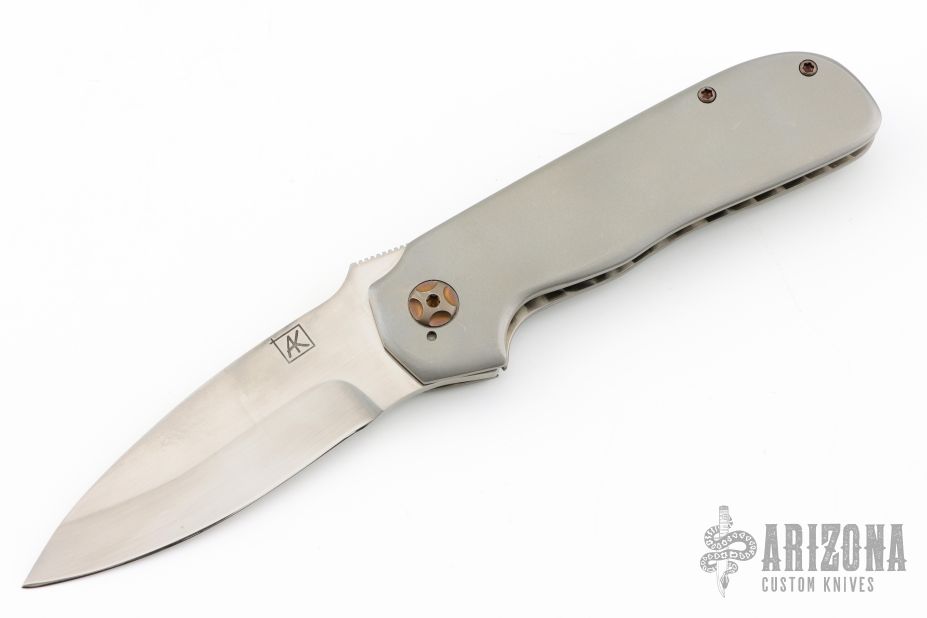 The MAZ framelock flipper by Alan Kritzman features a hand rub satin finished blade with a notched flipper.  The frame is bead blasted titanium with matching clip and backspacer. Rides on bearings, nice detent, lockup and blade seating. The knife has anodized hardware and jeweled interiors. Comes with original COA dated July 2020 and maker's card. Has some scratches and scuffs on the body, great condition otherwise.