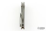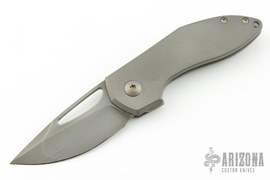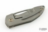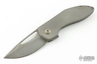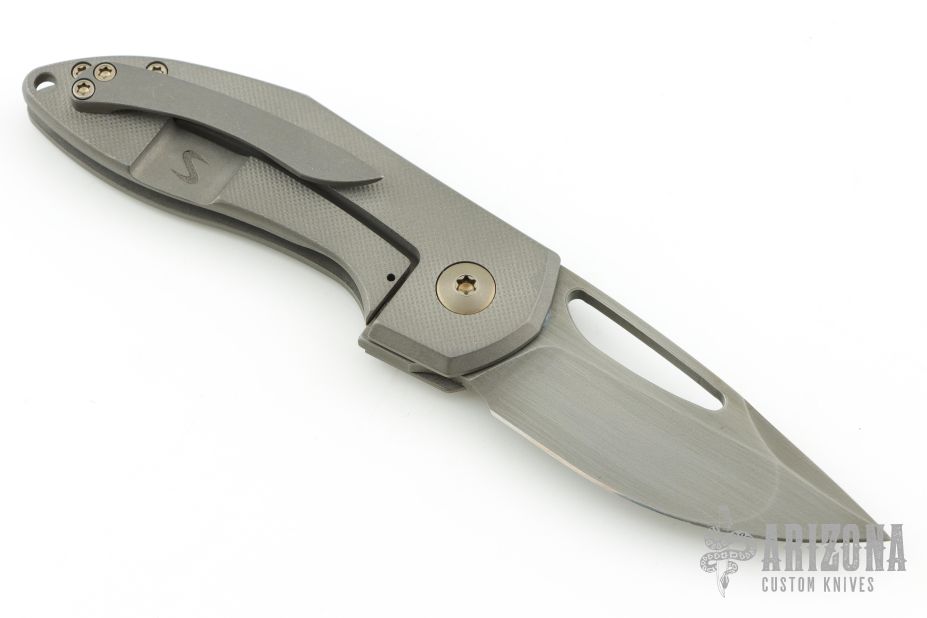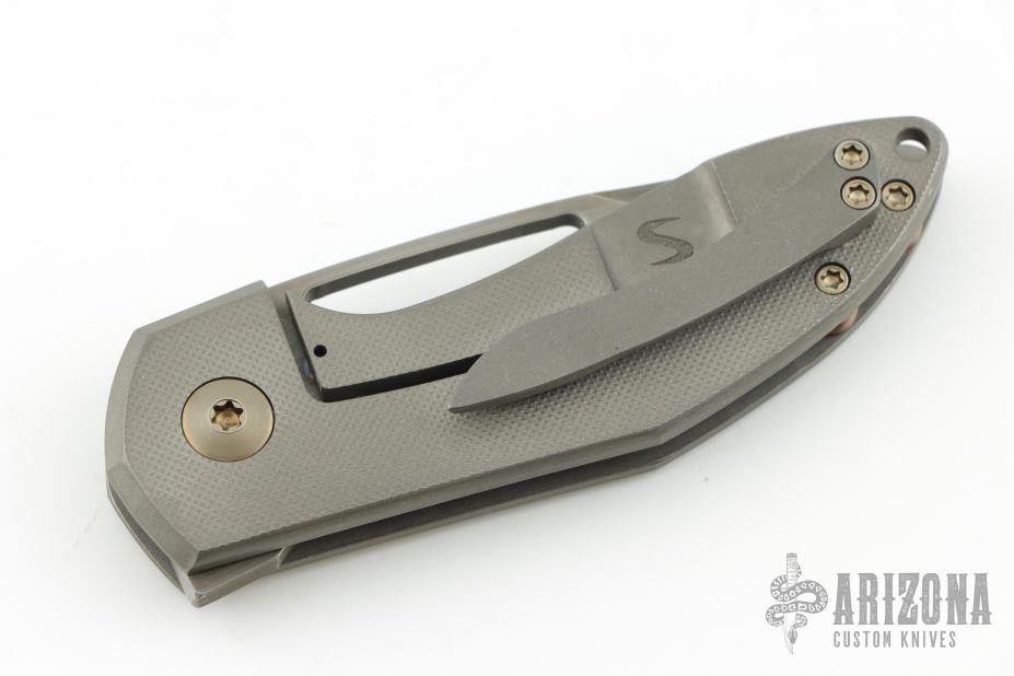 This Hobbit flipper from Simeon Custom Knives features a compound ground blade with a "Smoke" hand rubbed satin finish. The titanium handles are tumbled, tumbled titanium clip and anodized hardware. This knife flips very well and locks up with absolutely no play. Blade is centered when closed. Pocket clip is positioned for tip up carry. Comes with COA dated DEC 2023.