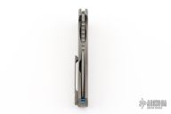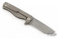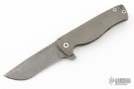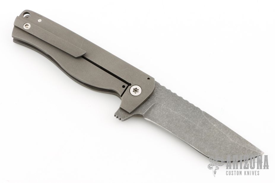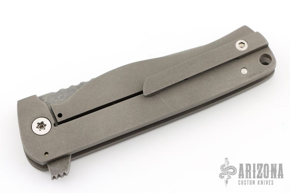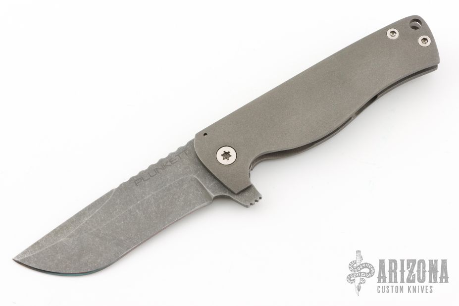 This P4 by Plunkett Blade Works features a dark tumble finished blade with notched thumbrest and flipper. The handle has a bead blasted titanium frame with matching tip up clip. Nice detent, lockup and blade seating. Comes with a COA dated 3-7-15. Has a couple light scuffs, otherwise excellent condition.