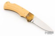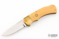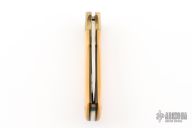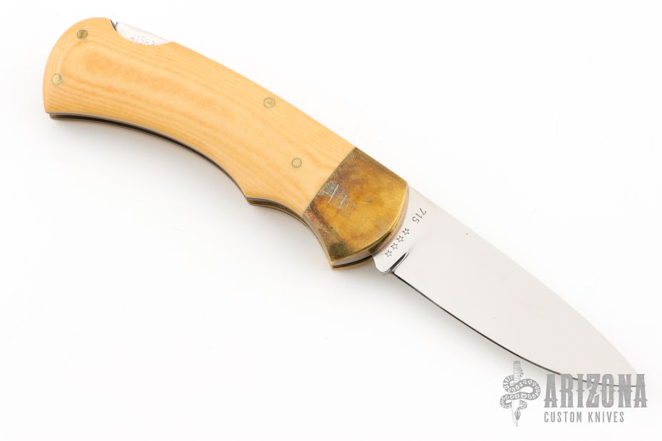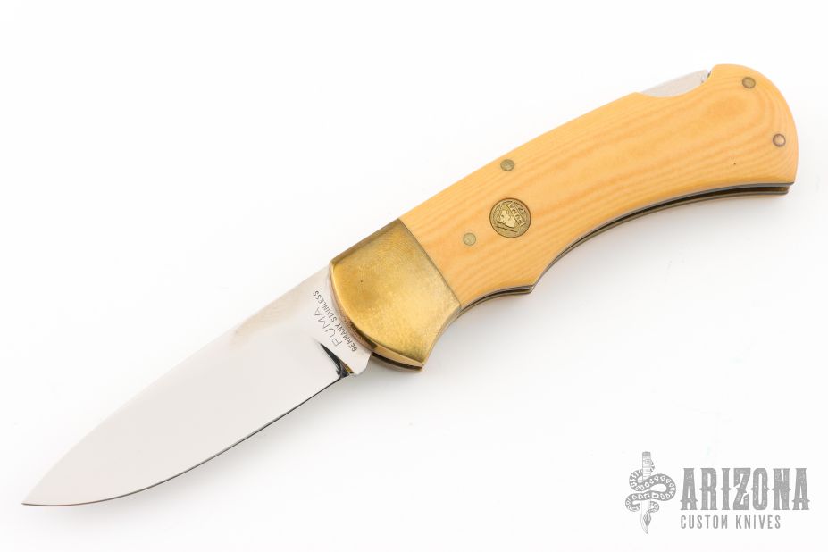 This Four Star Lockback from Puma Knives features a mirror finished drop point blade. The handle has brass bolsters, yellow paper micarta scales with black liners, brass liners and pin with a stainless backspacer. Has a few light scratches, otherwise excellent condition. #41582