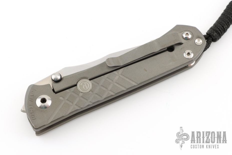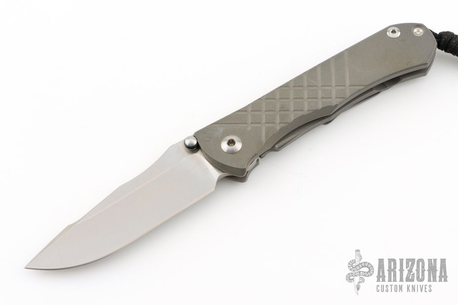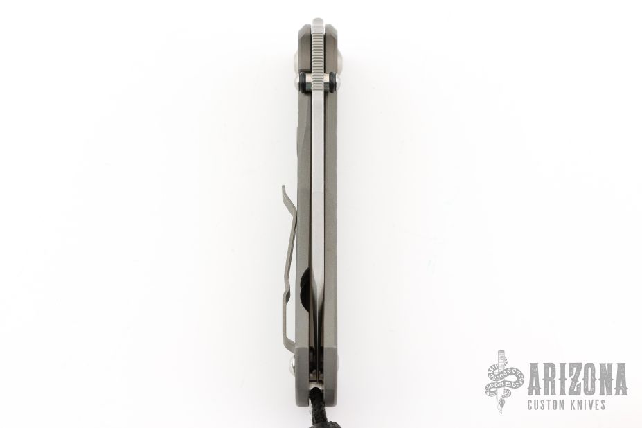 This Umnumzaan Framelock Folder by Chris Reeve Knives has a stonewashed clip point blade with dual thumb studs and notched thumb rest. Handle is bead blasted titanium with titanium barrel spacer, titanium tip up clip, and lanyard hole with lanyard. Nice detent, lockup and blade seating. Comes with original papers and COA dated May 28, 2020. Has scuffs, otherwise good condition.