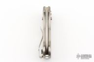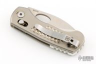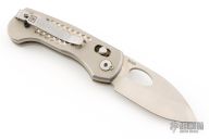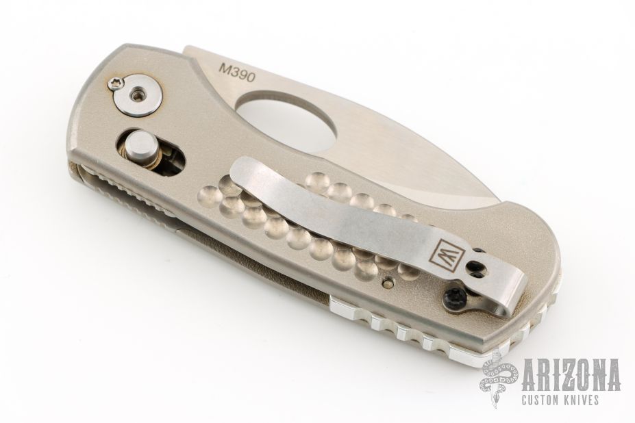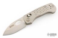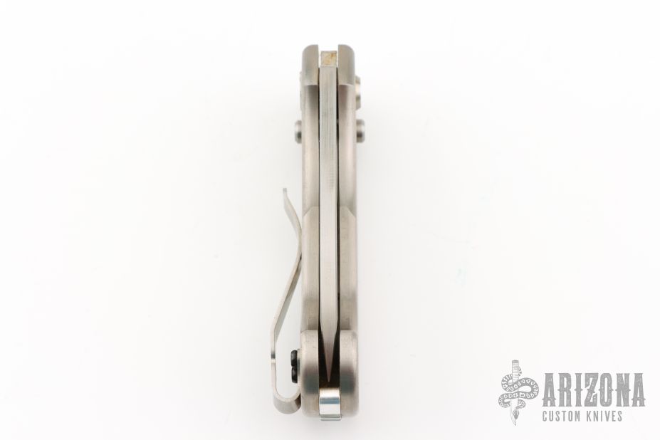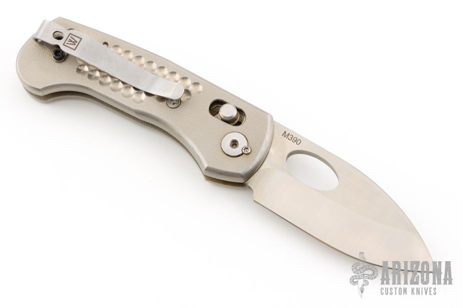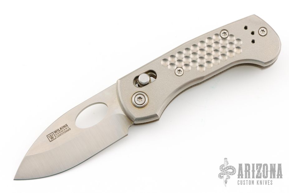 This knife by Kevin Wilkins features a satin finished drop point blade with thumbhole. The handle has a heavy orange peel finished titanium frame with an aluminum backspacer and reversible tip up stainless steel clip. Has scuffs, otherwise excellent condition. Comes with a COA dated February 2022