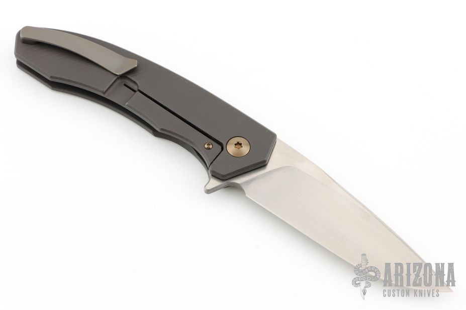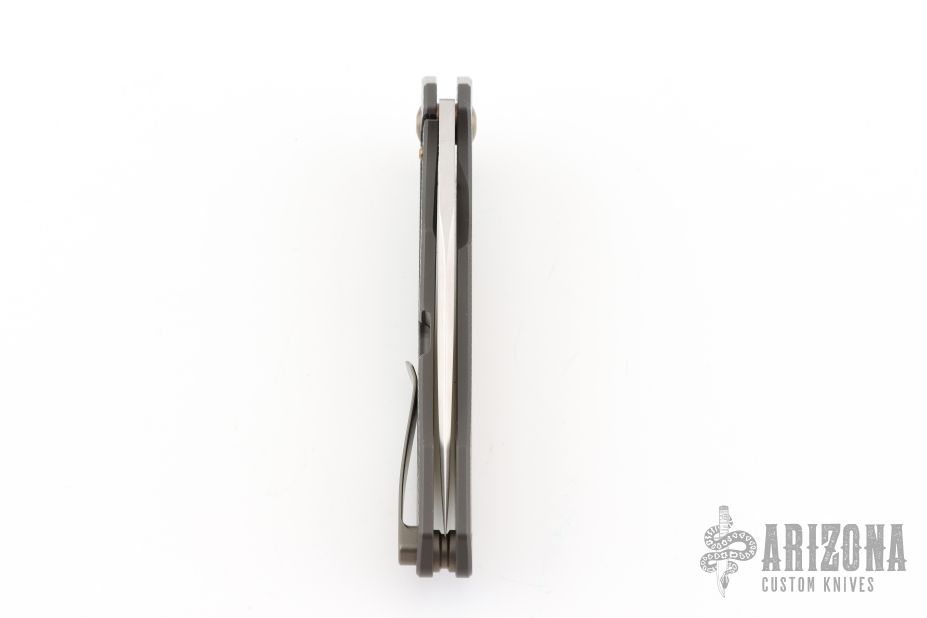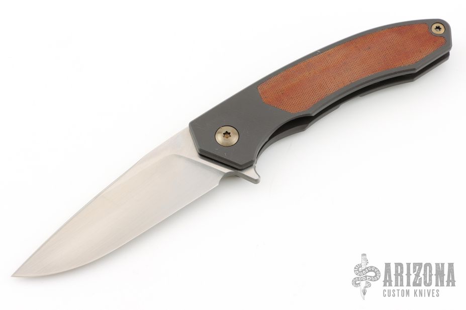 This Dakar by Burger Knives features a hand rub satin finished blade with flipper. The handle has a milled black titanium frame with natural canvas micarta inlay, anodized titanium hardware, blasted titanium tip up clip with hidden screws. Rides on bronze phosphorus washers, ceramic detent and pivot, nice detent, lockup and blade seating. Comes with COA dated December 2023. Excellent condition.