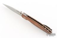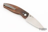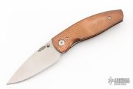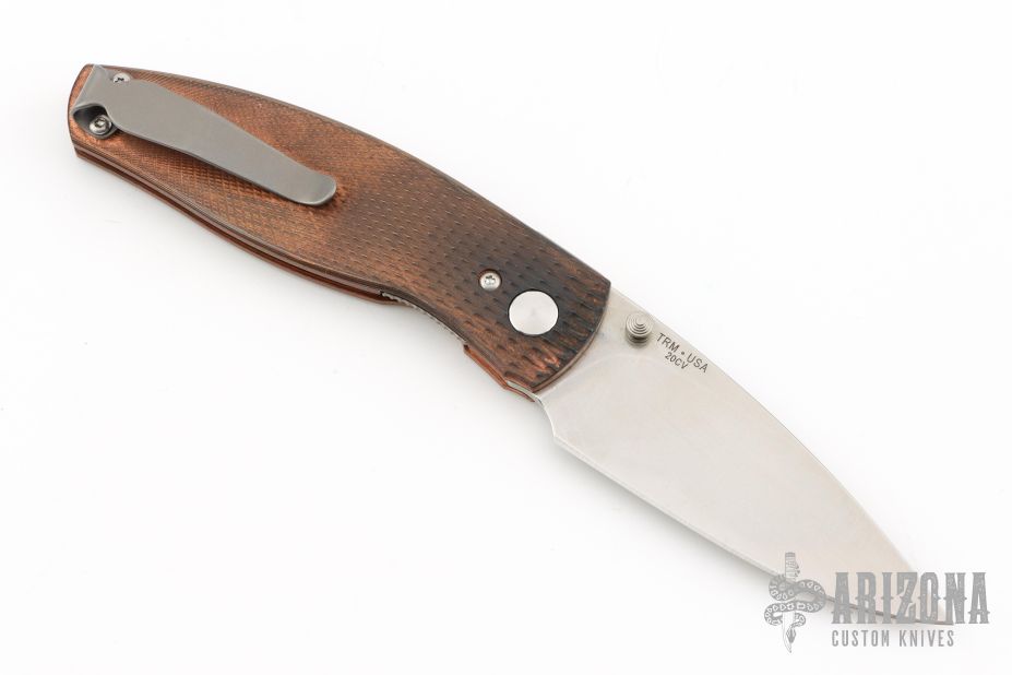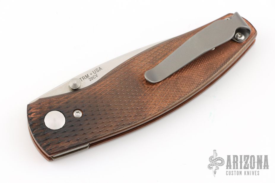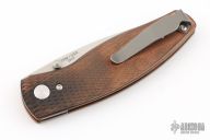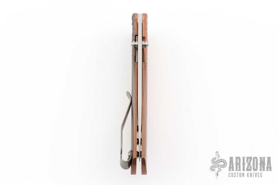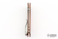 This Neutron Linerlock by Three Rivers features a stonewash finished blade with dual thumbstuds. The handle has milled copper scales, titanium liner with a titanium tip up reversible clip. Nice detent, lockup and blade seating. Has a couple light scuffs and patina, otherwise excellent condition.