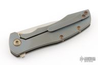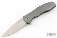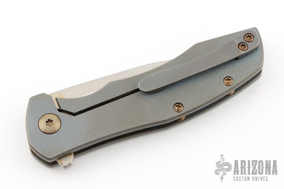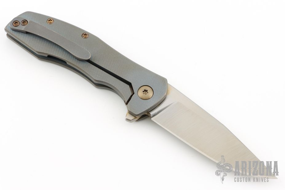 This Mini Workman Flipper by Cox Workshop features a satin finished blade with flipper. The handle has a checker milled and anodized titanium frame with anodized titanium hardware, tip up titanium clip. Nice detent, lockup and blade seating. Has some light scuffs, otherwise excellent condition.