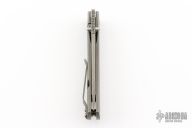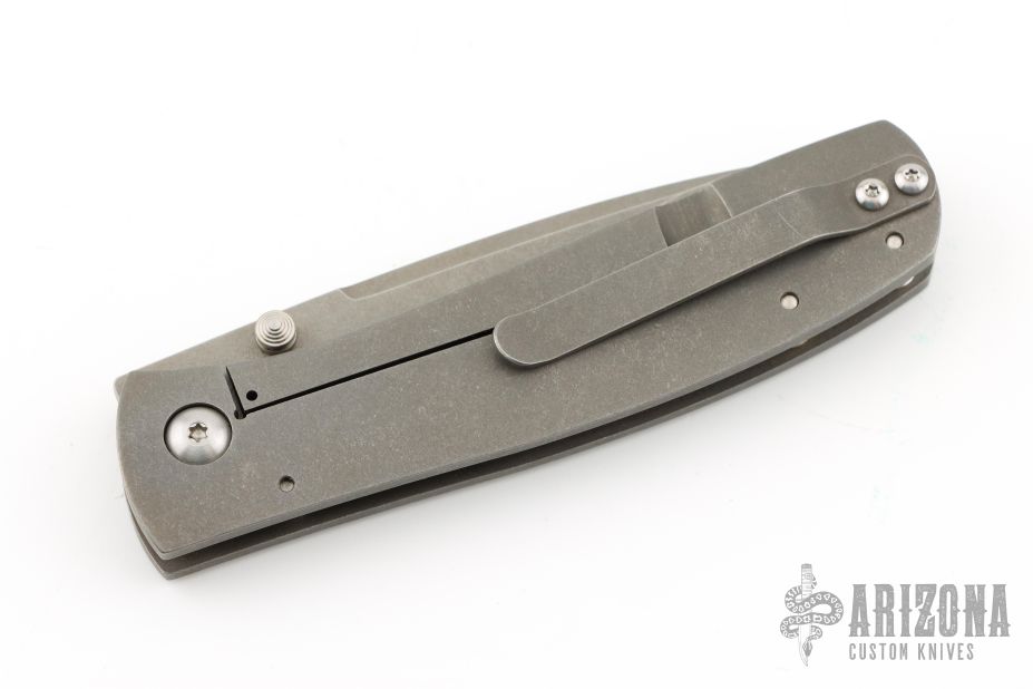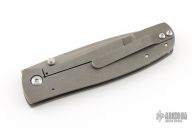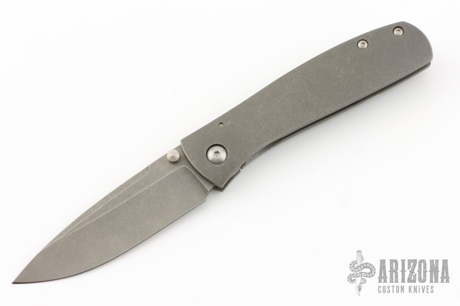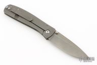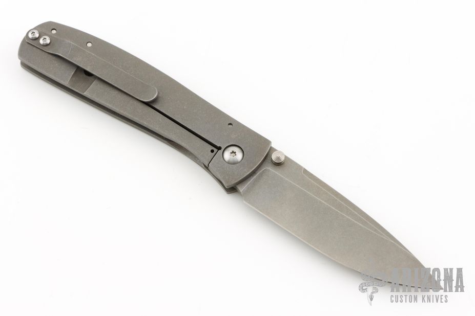 This Jasmine by Ray Laconico features a stonewash finished drop point blade with dual thumbstuds. The handle has a stonewashed titanium frame with a matching titanium tip up clip. Nice blade seating, detent and lock up. Excellent condition.