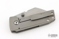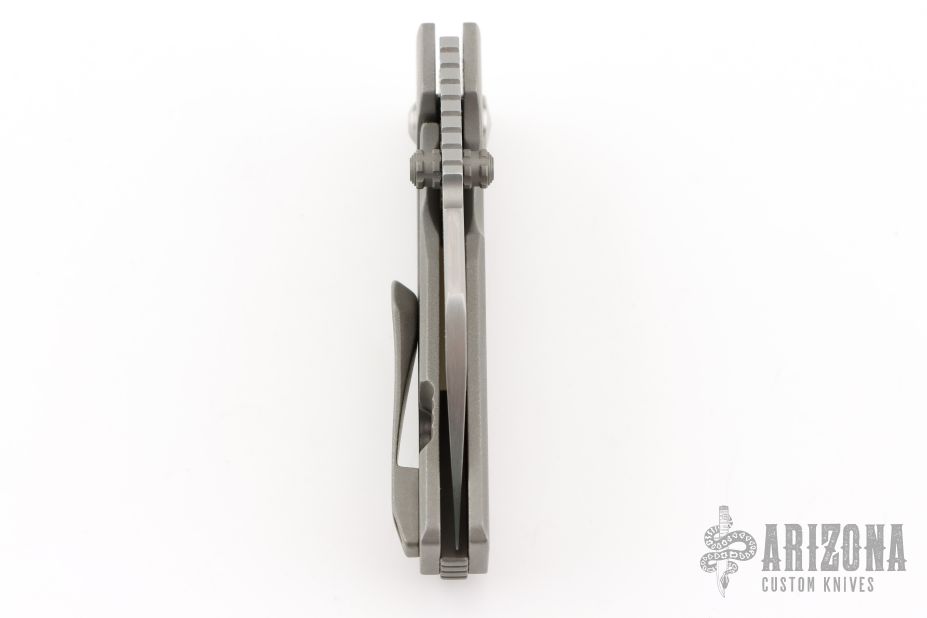 This Knife by Morrish Made Knives features a stonewashed blade with notched thumbrest and dual thumbstuds. The handle has a stonewashed titanium frame with a blasted orange peel finish, matching titanium tip up clip and backspacer. Rides on bearings, nice detent, lockup and blade seating. Excellent condition.
