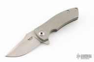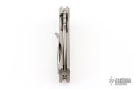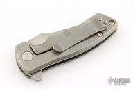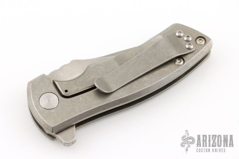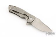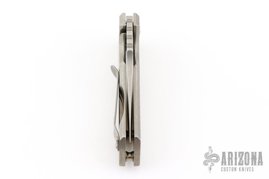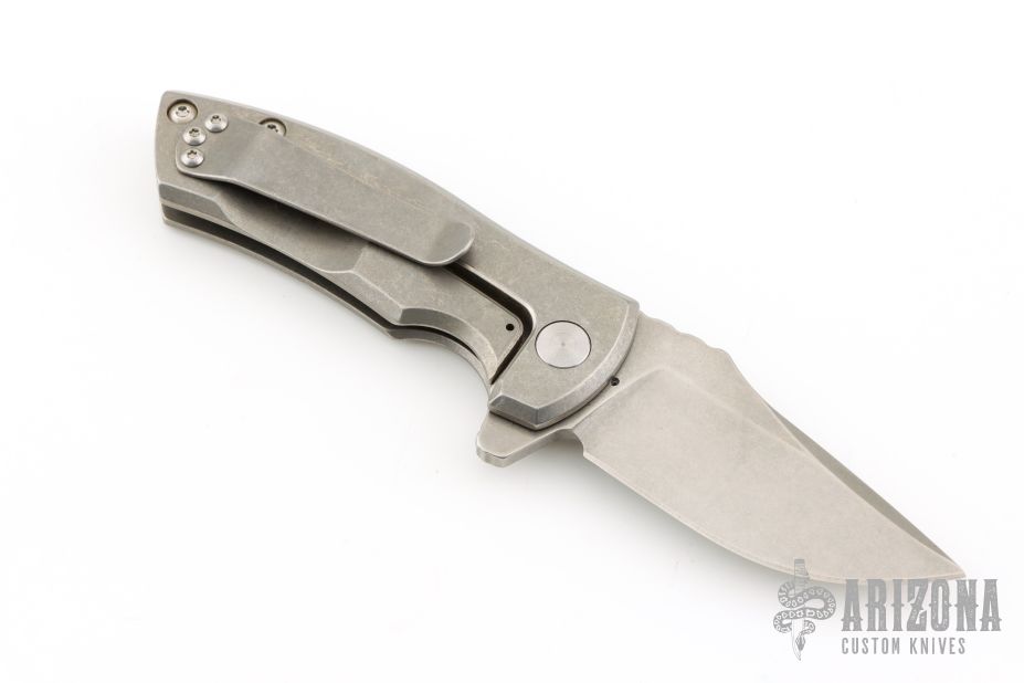 This ESV Flipper by Les George features a tumble finished Magnacut blade with notched thumbrest and a flipper. The handle has a stonewashed titanium frame and titanium pocket clip for tip up carry. Smooth function with a lock up and nice detent. Excellent condition.