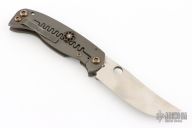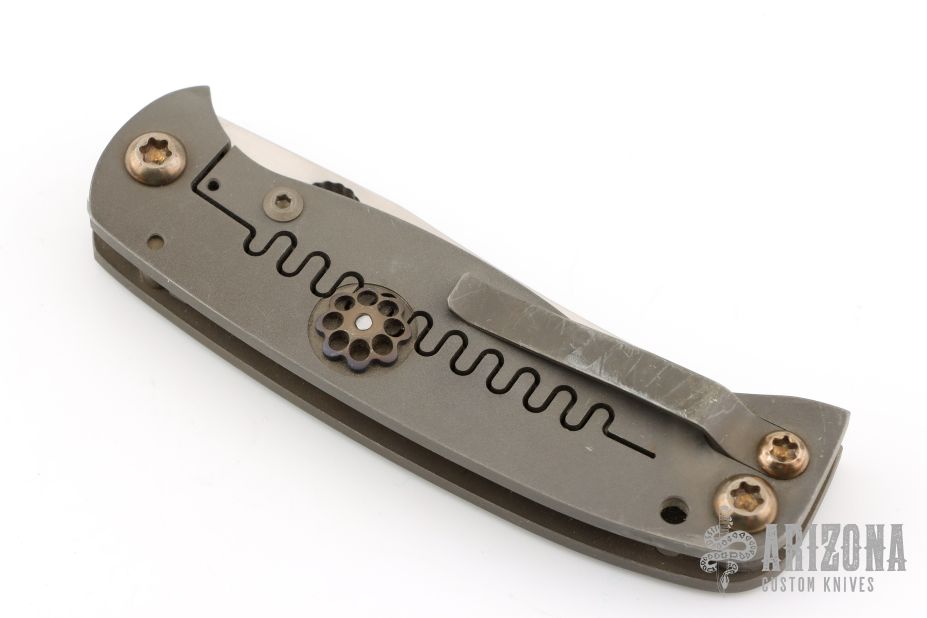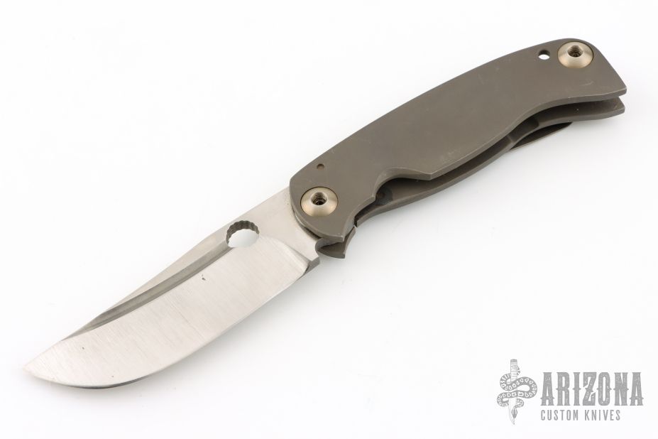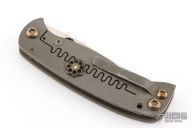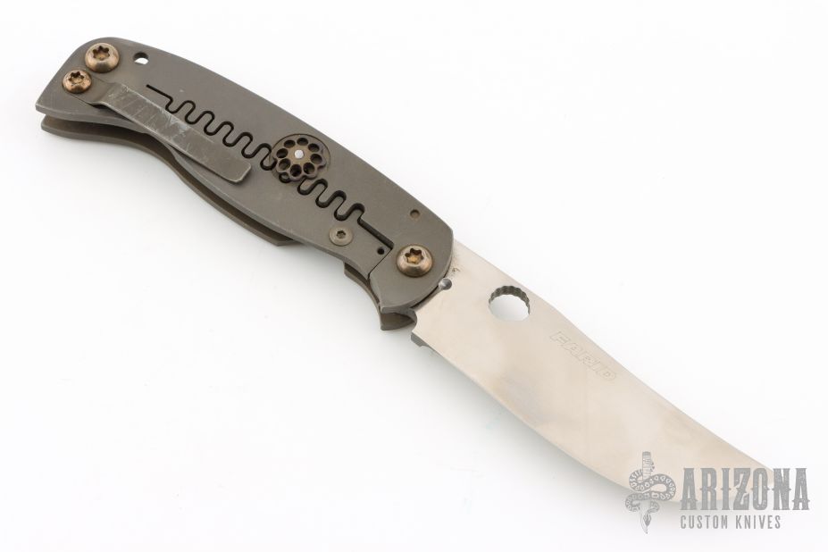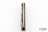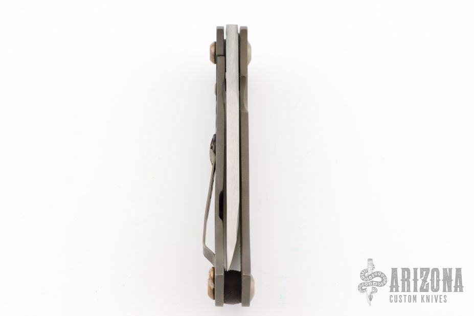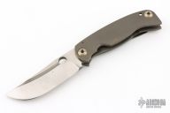 This Mini K2 framelock folder by Farid Knives features a satin finished chisel ground D3 steel blade with fuller and thumbhole. The handle has a bead blasted titanium frame with an anodized titanium clip and bronzed hardware. Nice detent, blade seating, and lockup. Has a stainless lockface insert and a titanium barrel spacer. Has some scuffs and scratches, otherwise good condition.