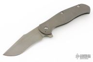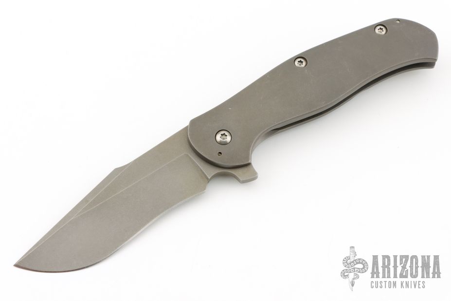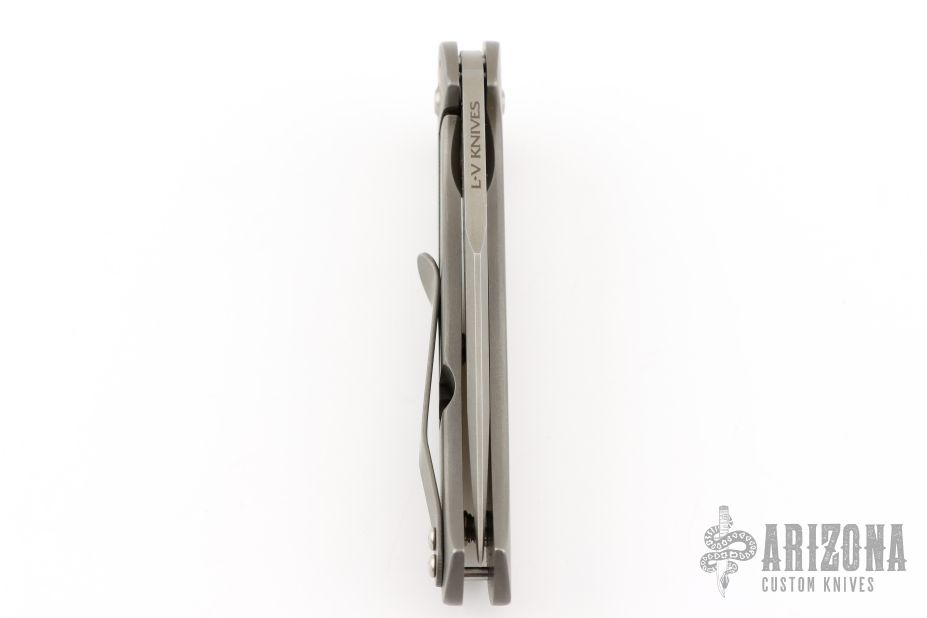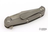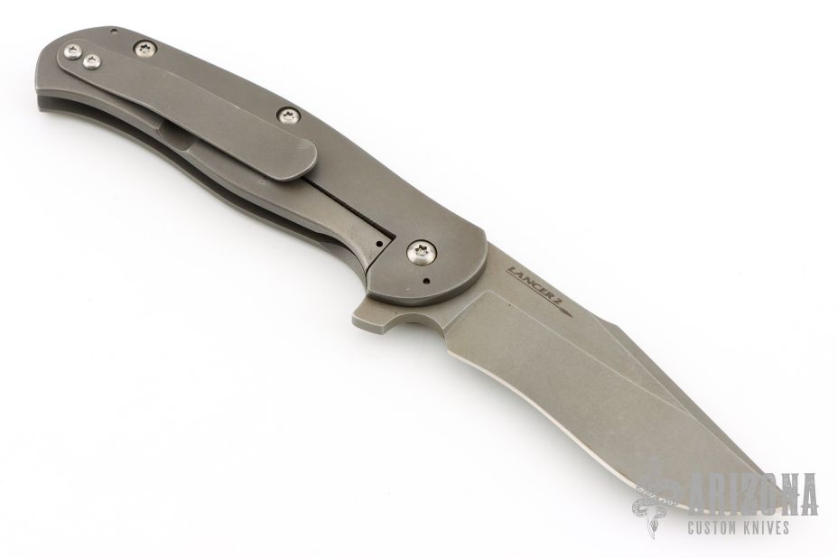 This Lancer 2 is a Colaboration between Ray Laconico and Michael Vagnino. It features a tumble finished recurve blade with false top edge and flipper. The handle has an tumble finished titanium frame with matching tip up clip. Titanium barrel spacers and lanyard pin at the butt. Nice detent, blade seating and lockup. Has a few light scuffs, otherwise excellent condition.