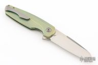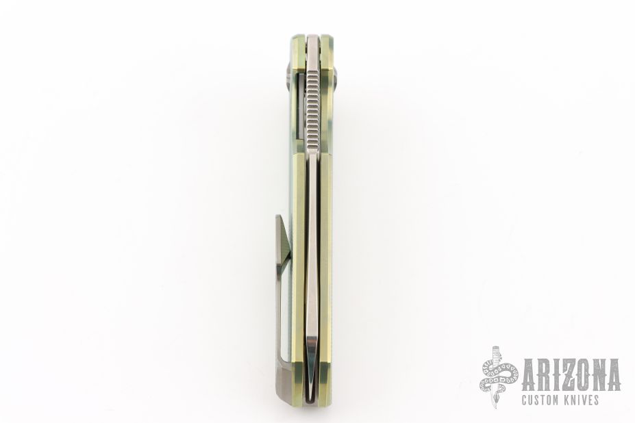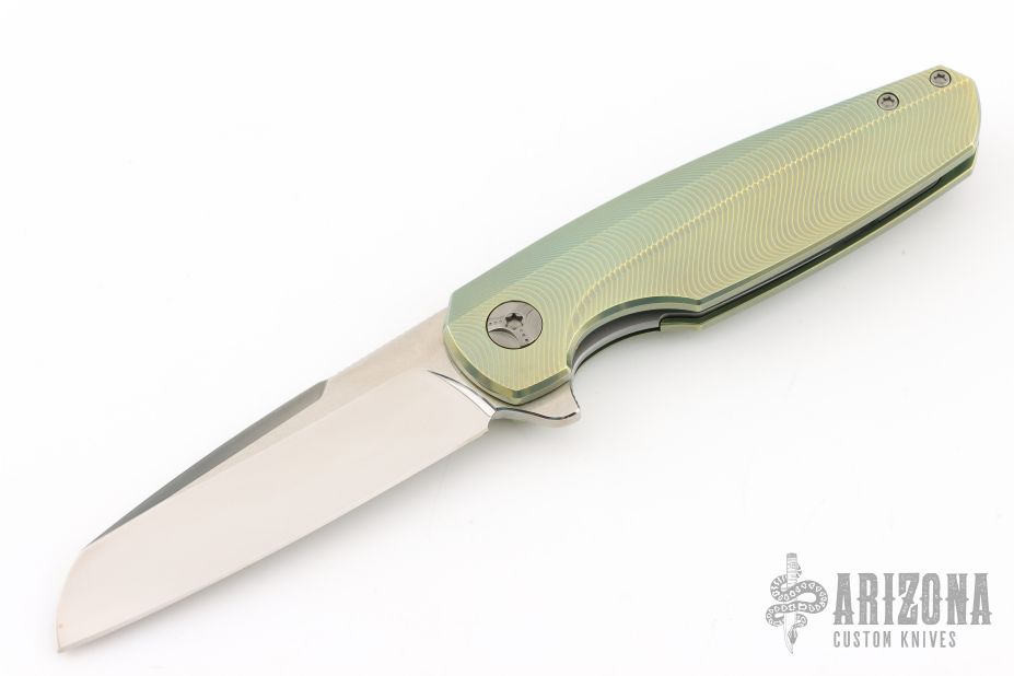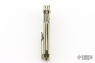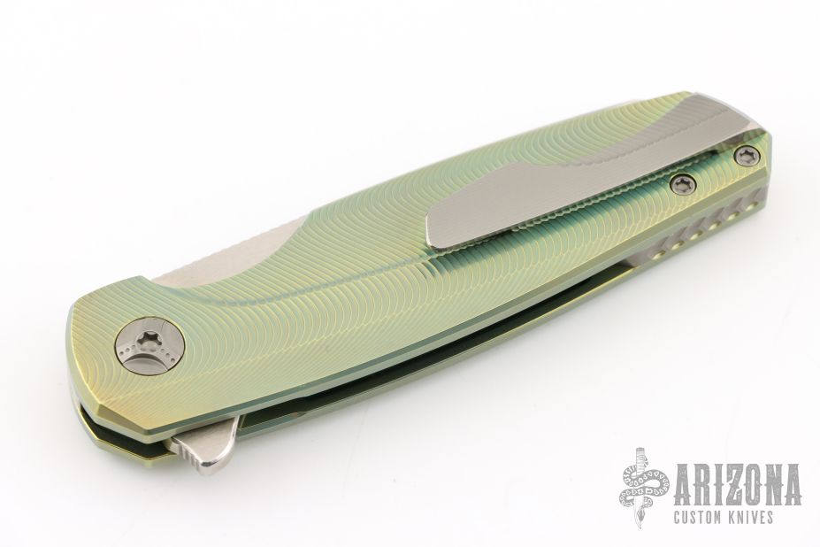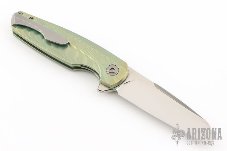 This Haptic by Holt Bladeworks features a near mirror tumbled blade with a notched thumbrest and flipper tab. The handle features a milled and anodized titanium frame with a titanium tip up pocket clip with hidden hardware and backspacer. Nice detent, lock up and blade seating. Includes COA. Excellent Condition.