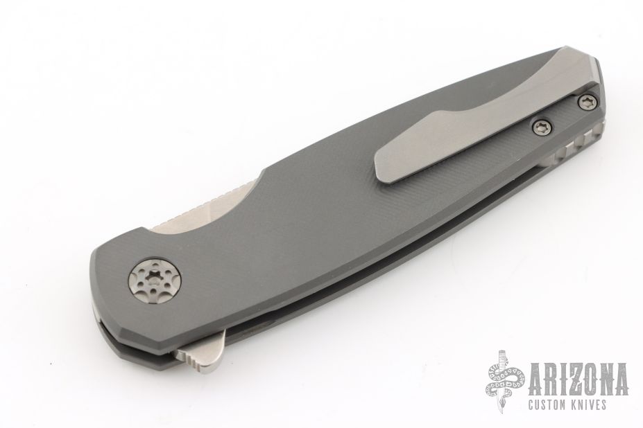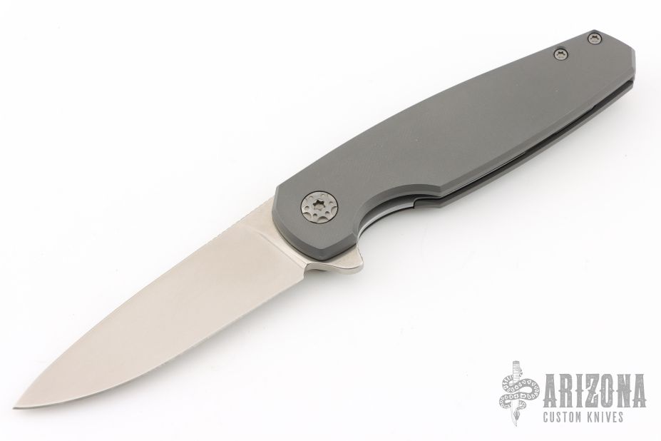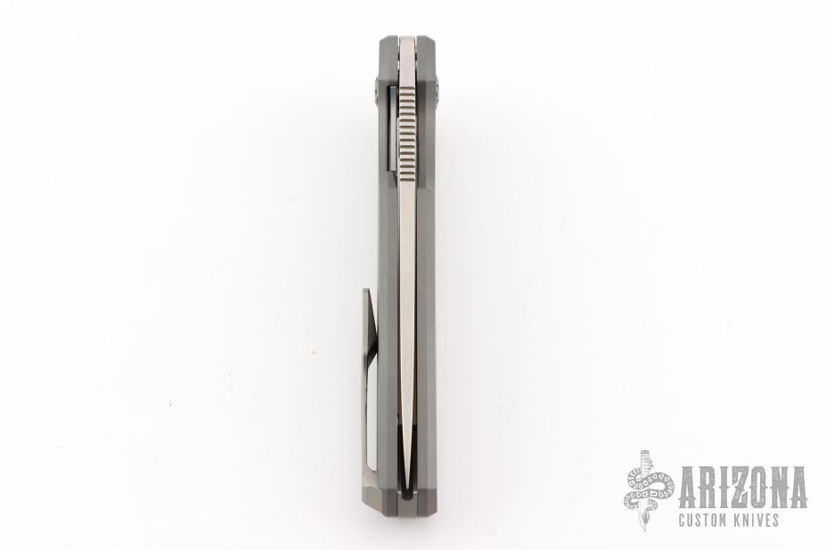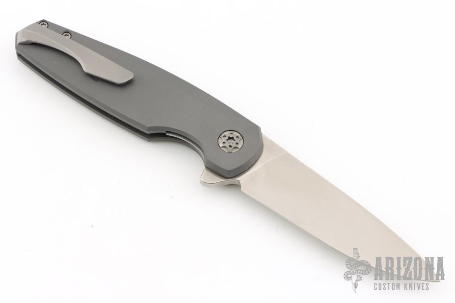 This Morpheus by Holt Bladeworks features a stonewashed blade with a notched thumbrest and flipper tab. The handle features a milled and blasted titanium frame with a tip up pocket clip with hidden hardware. Nice detent, lock up and blade seating. Includes COA. Excellent condition.