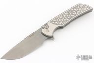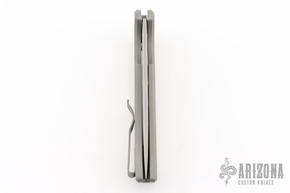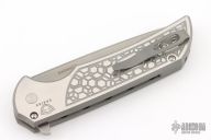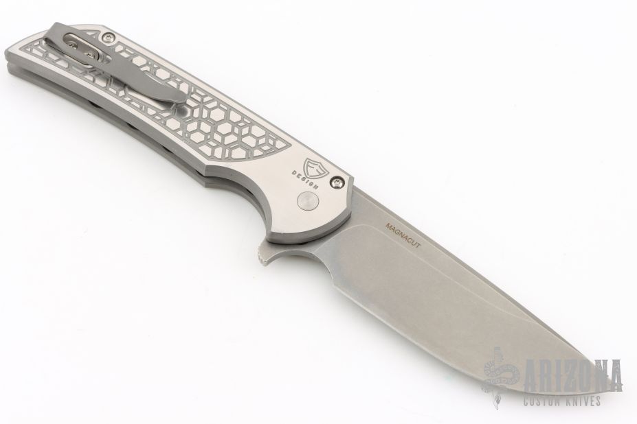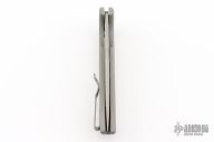 This Mordax by Pro-Tech is a Ferrum Forge design and features a stonewashed drop point blade with flipper. The handle has a two-tone stainless steel frame with "gridlock" pattern blasted tip up stainless steel clip. Black lip pearl push button. Excellent condition.