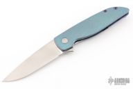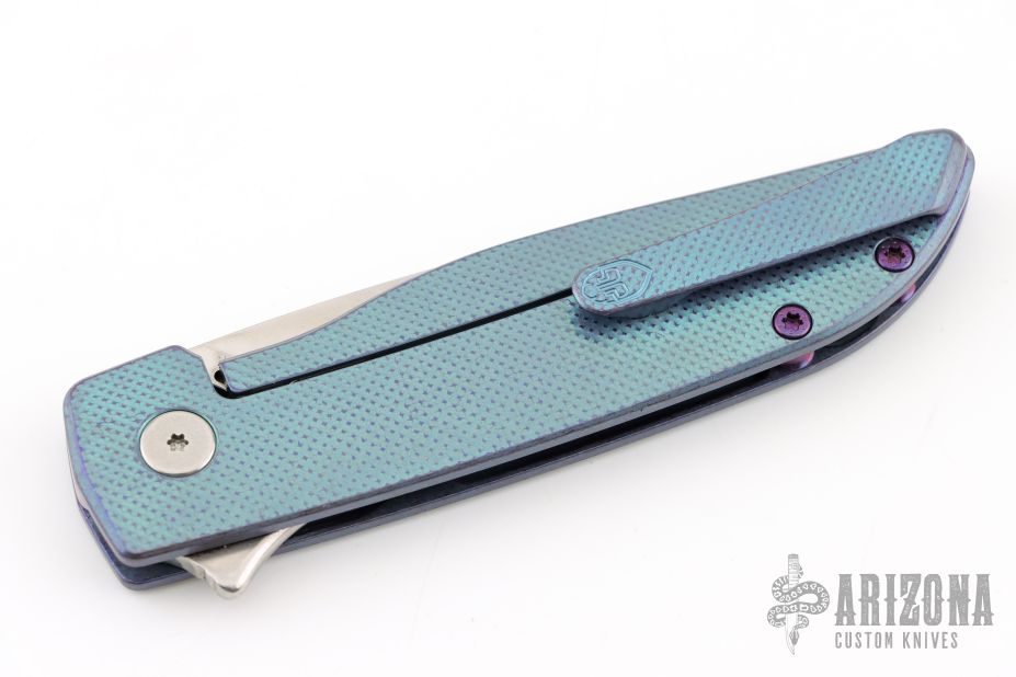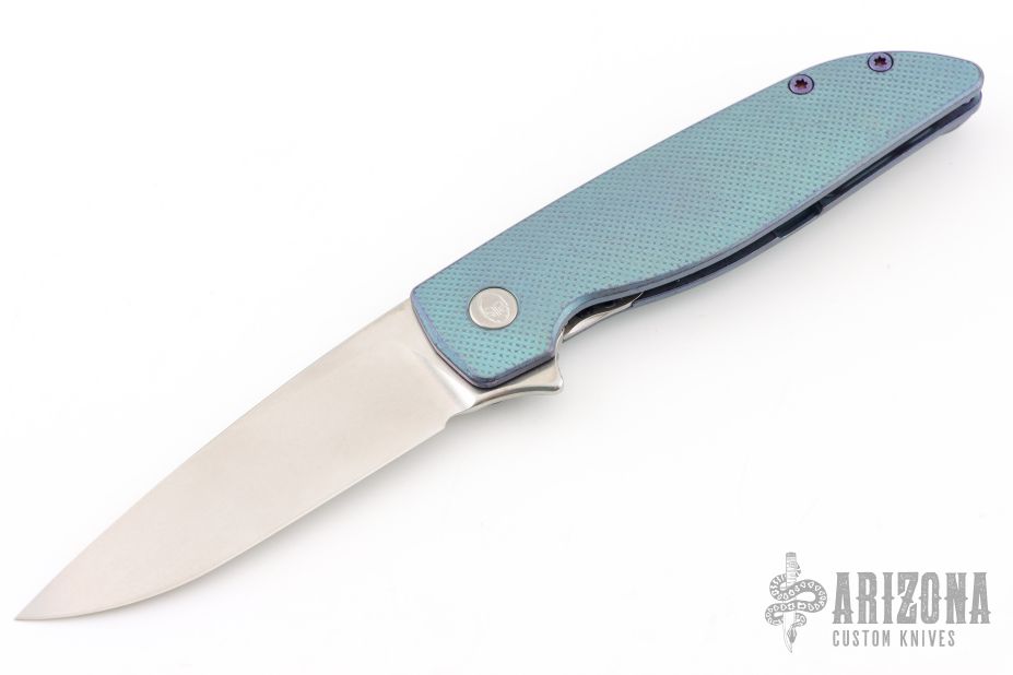 This Rask by John Grimsmo of Grimsmo Knives features a stonewash finished blade with notched flipper. The handle has a checker milled, anodized and tumbled titanium frame with matching tip up clip that has hidden screws, titanium barrel spacers and screws. Numbered #1495 on the spine of the blade. Excellent condition.