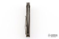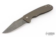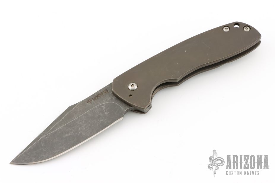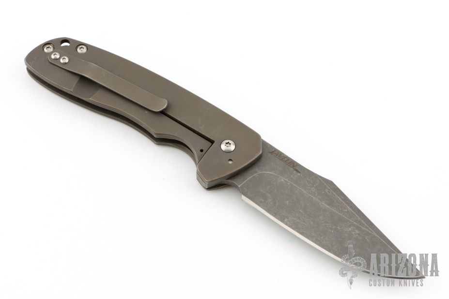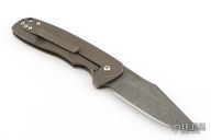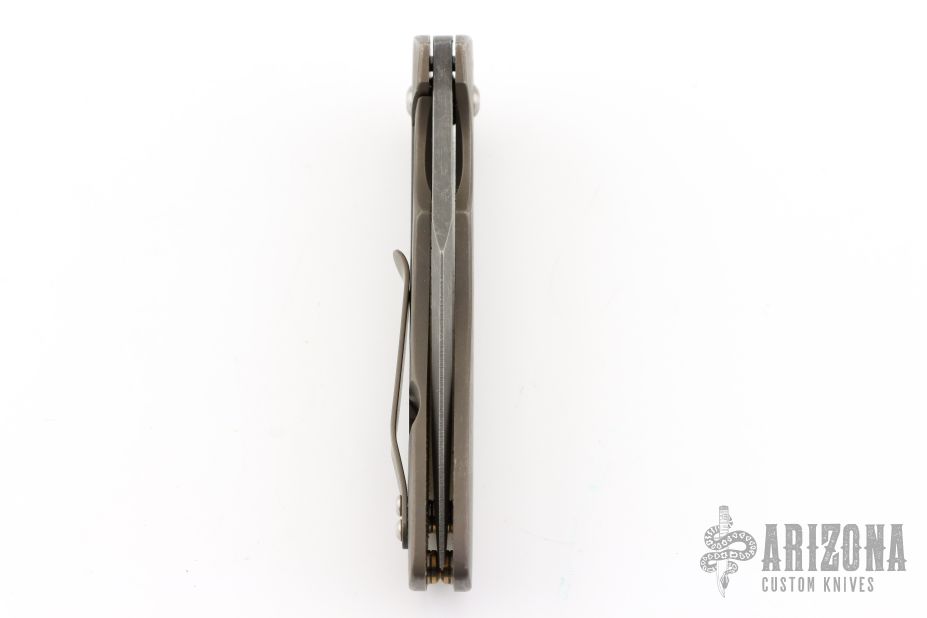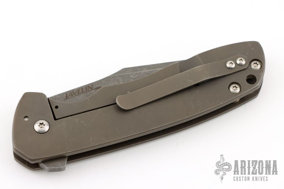 This Javelin is a Collaboration between Ray Laconico and Michael Vagnino. This knife features a dark tumble finished blade with false top edge and flipper. The handle has a tumbled titanium frame with matching tip up clip. Titanium barrel spacers and lanyard hole at the butt. Nice detent, blade seating and lockup. Has scuffs, otherwise good condition.