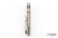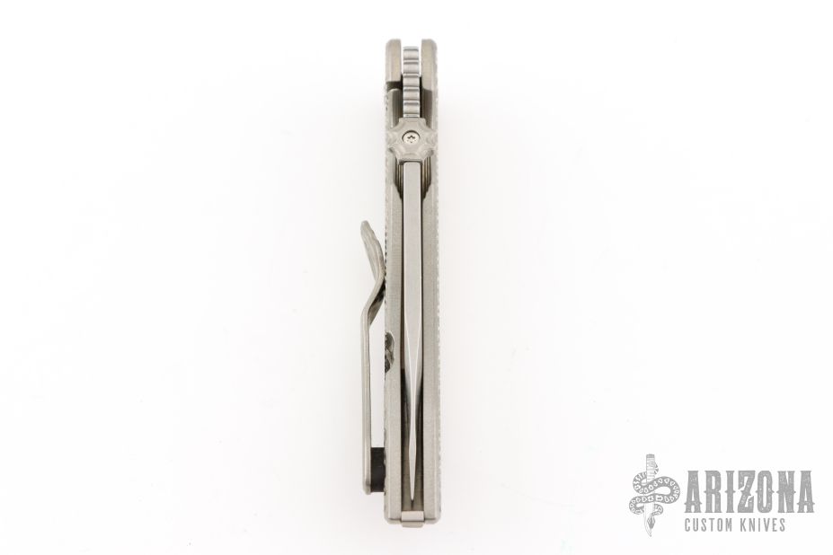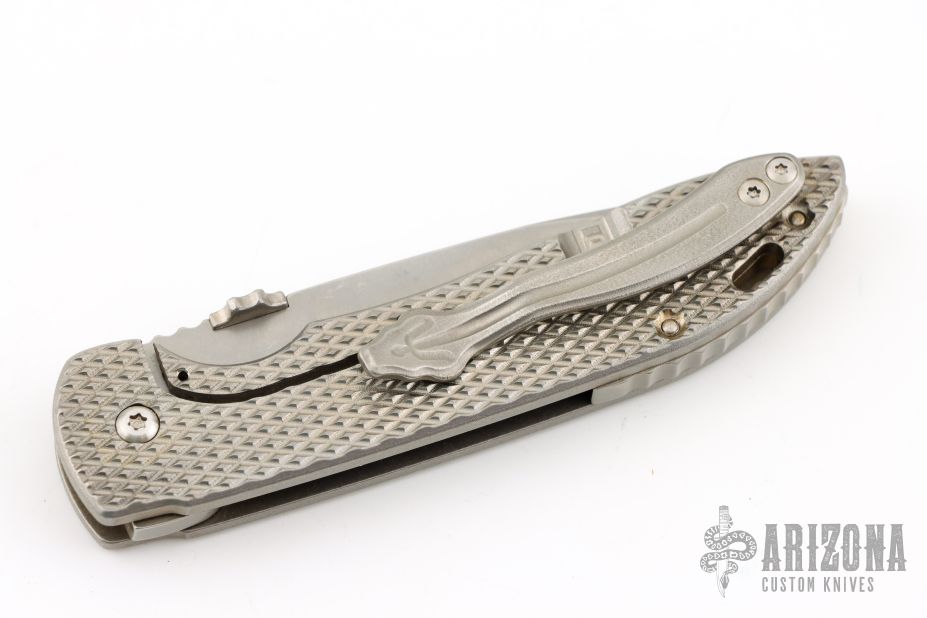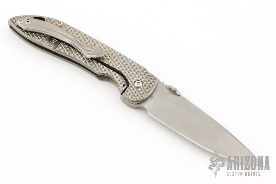 This K2 framelock flipper features a stone wash finished blade with thumbdisc and milled checker titanium frame. Titanium clip is positioned for tip up carry. Includes IKBS (Ikoma-Korth Bearing System) for smooth and fast opening that requires no wrist action. Strong detent. Perfect blade seating, detent, and lockup. Excellent work with great attention to detail. Excellent condition.