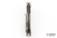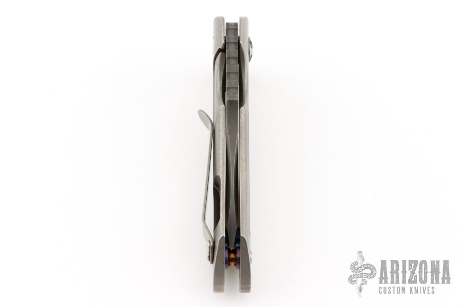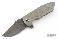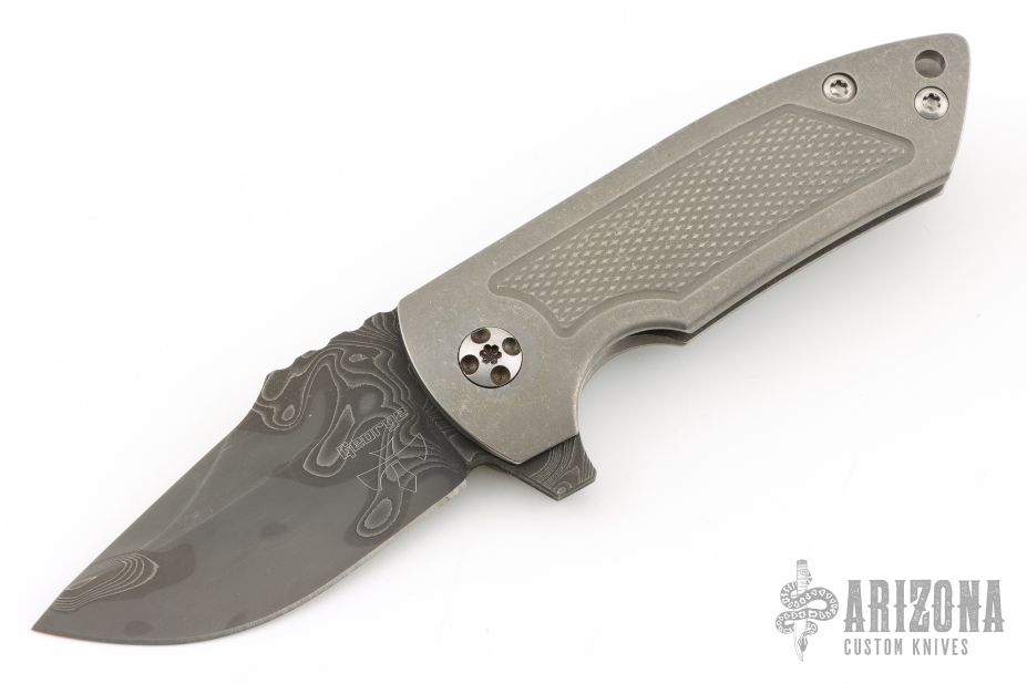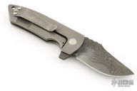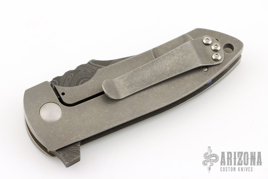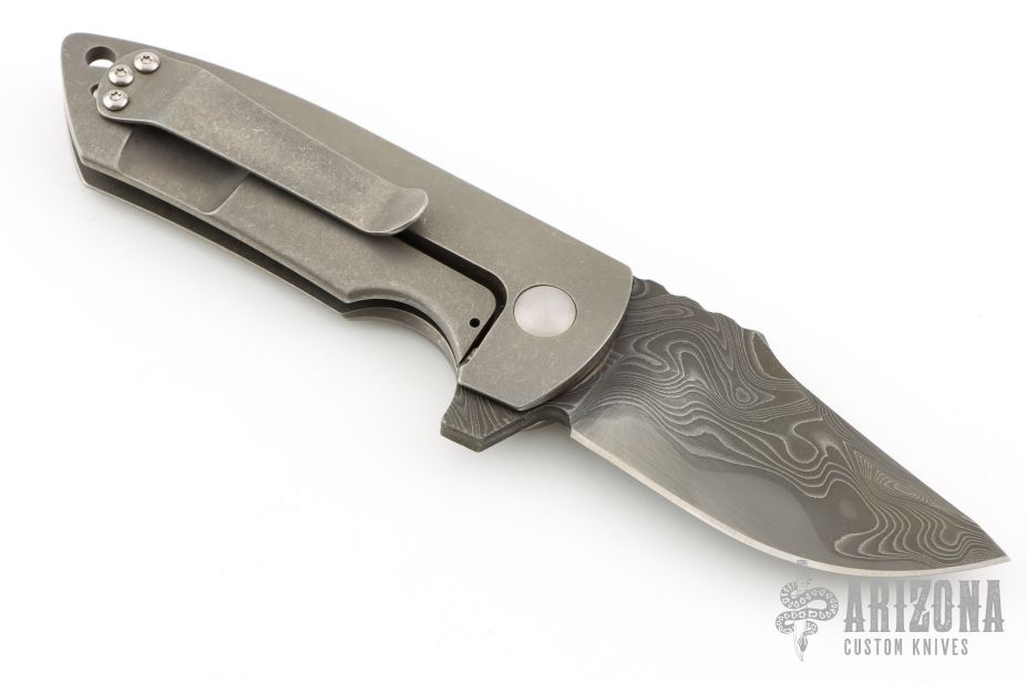 This frame lock flipper features a Chad Nichols SS Damascus blade with XHP core, notched thumb rest and a flipper. The handle has a tumble finished and milled titanium frame and pocket clip, tip up carry. Blade flies out when deployed. Nice detent, lockup and blade seating. Has some light scuffs/scratches on the blade, otherwise excellent condition.