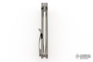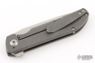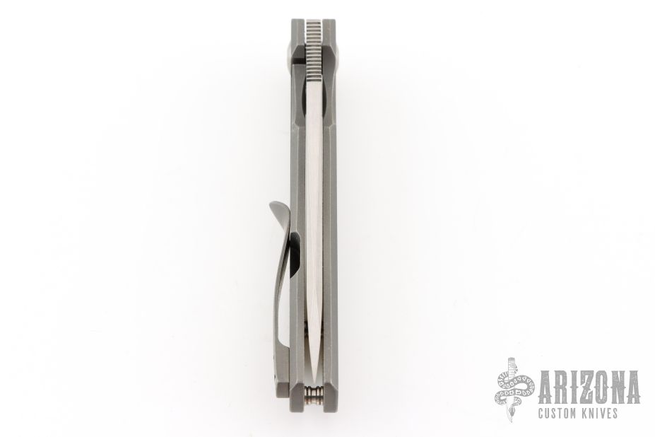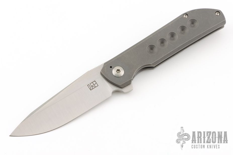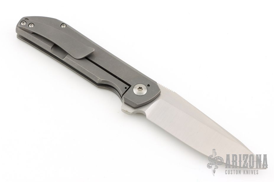 This knife by Jared Price features a satin finished blade with notched thumbrest and flipper. The handle has a tumbled titanium frame with matching tip up pocket clip. Nice detent, lock up and blade seating. Has some scuffs, otherwise excellent condition.