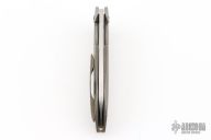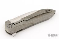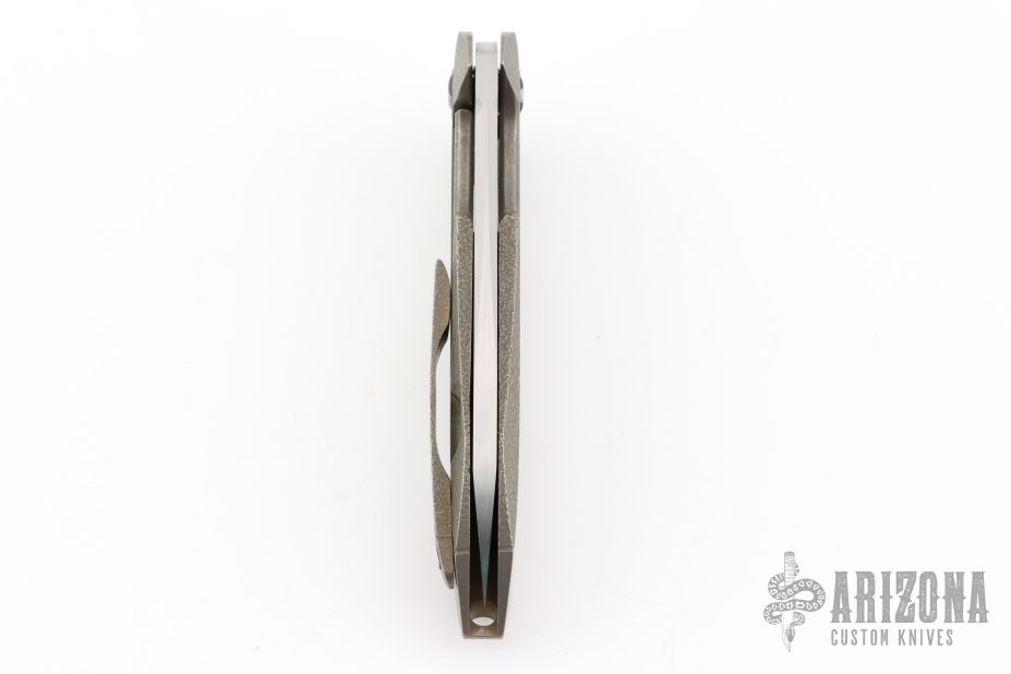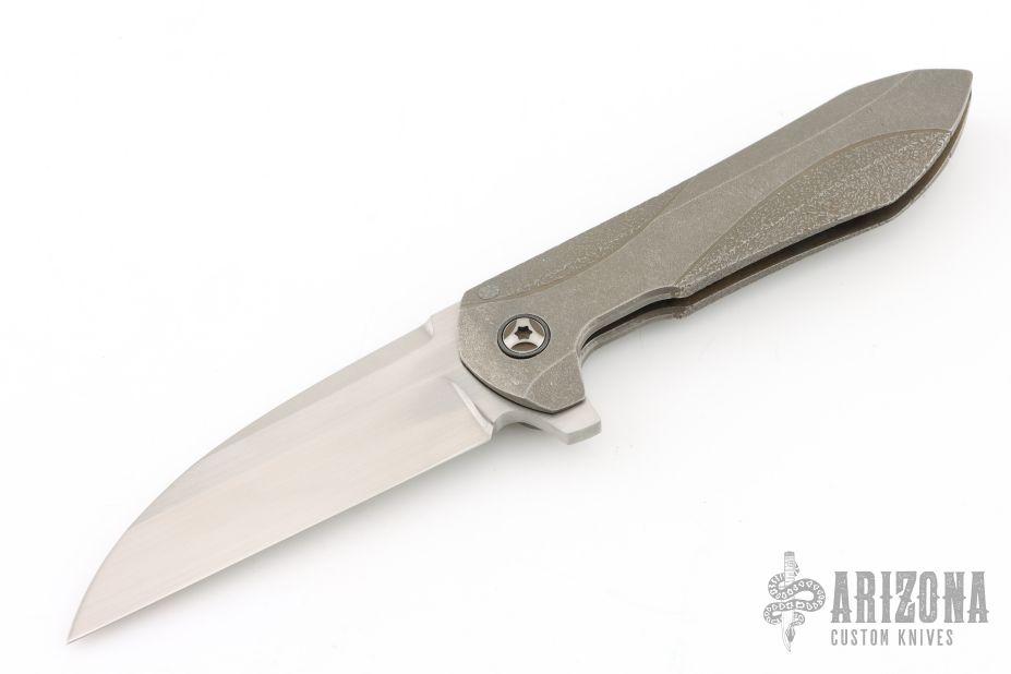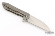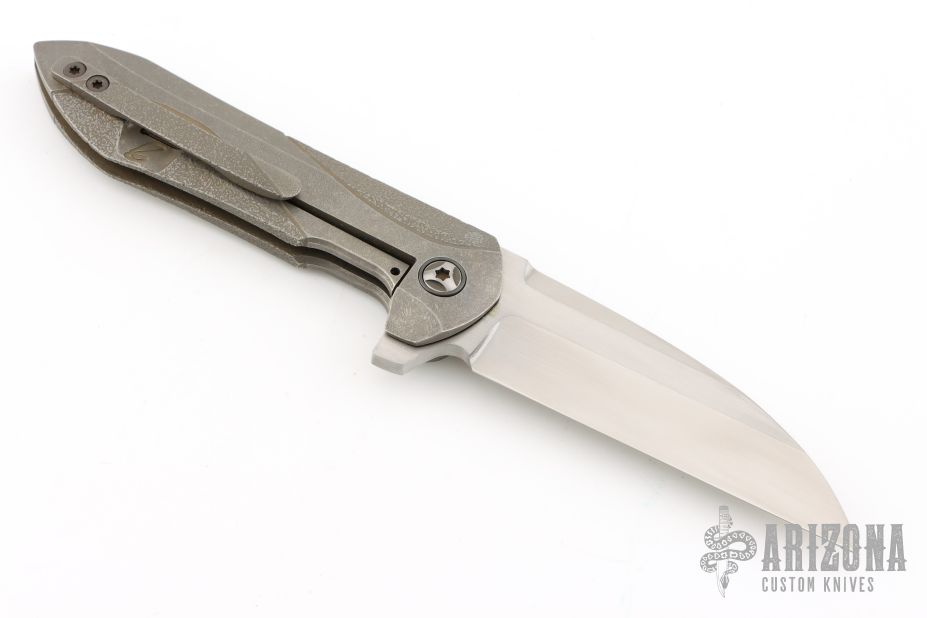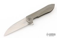 This Druid Flipper from Peter Rassenti features a hand rub satin finished wharncliffe blade with false top edge and flipper. The handle has a stonewashed and textured integral titanium frame that has been tumbled, "Prism Frame", tip up pocket clip, lanyard hole in frame. Excellent blade seating, detent and lock up. Excellent condition.