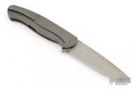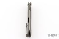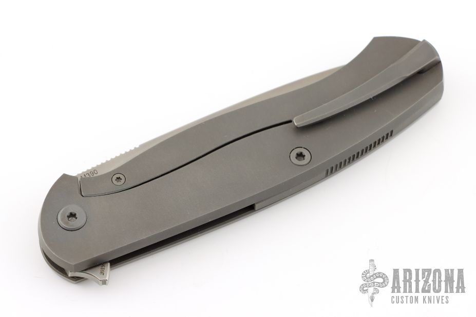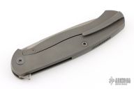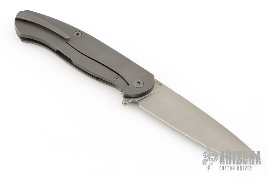 This Scout by Alexander Cheburkov features a matte finished blade with notched thumbrest and flipper. The handle has an anodized and bead blasted titanium frame with matching tip up clip and backspacer with lanyard hole. Clip has hidden screws. Rides on bearings, nice detent, lockup and blade seating. Dated 2019. Excellent condition.