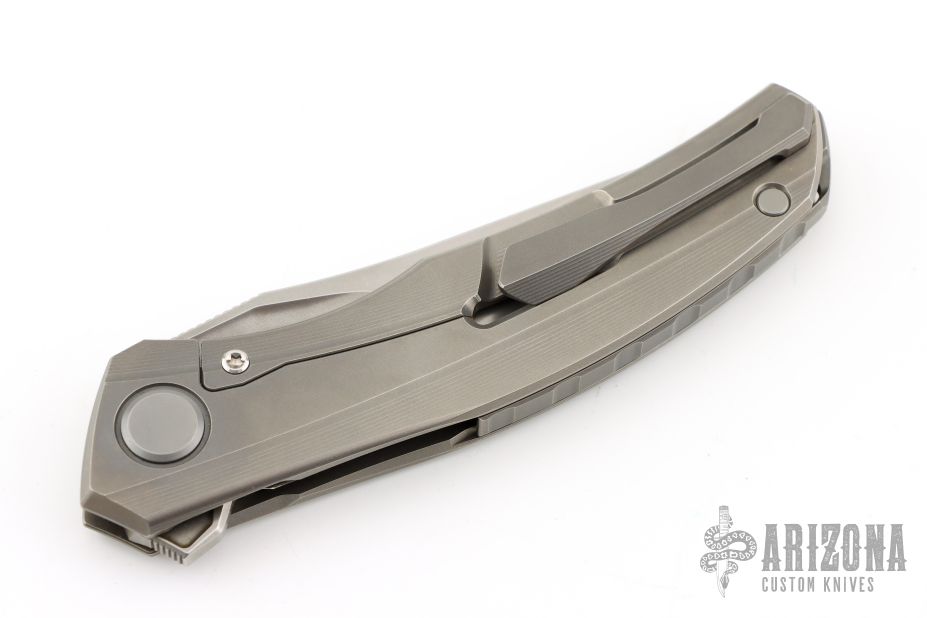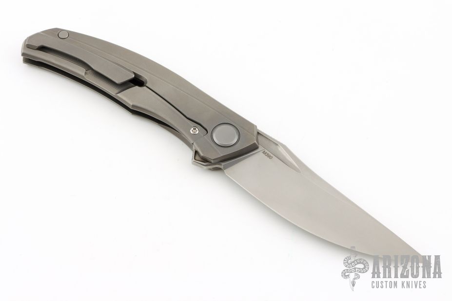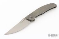 This Quantum by Shirogorov features a blasted blade with notched thumbrest and flipper. The handle has a blue anodized and milled titanium frame, backspacer, tip up titanium clip with hidden screws. Rides on MRBS, nice detent, lockup and blade seating. Comes with COA. Excellent condition.