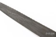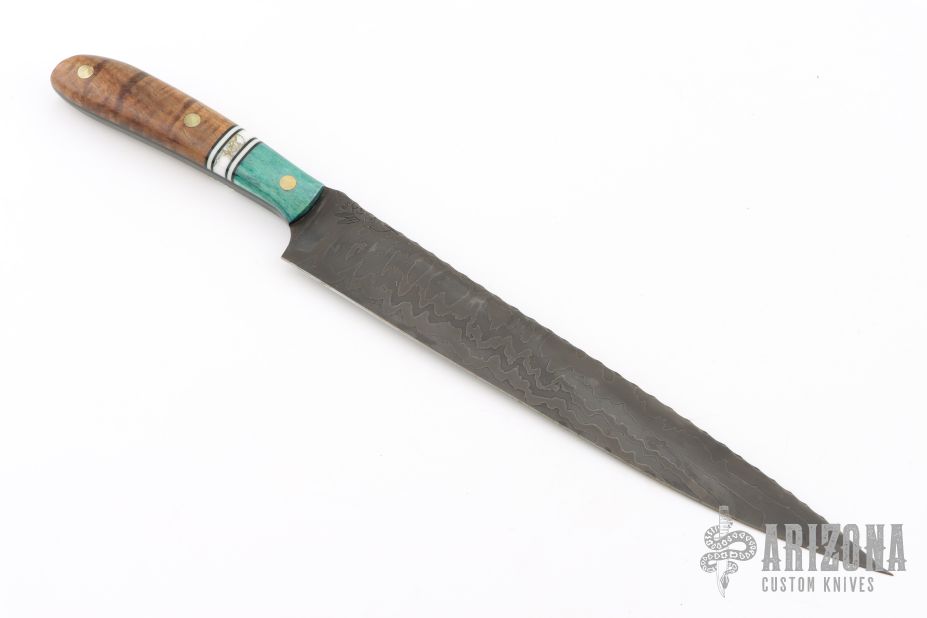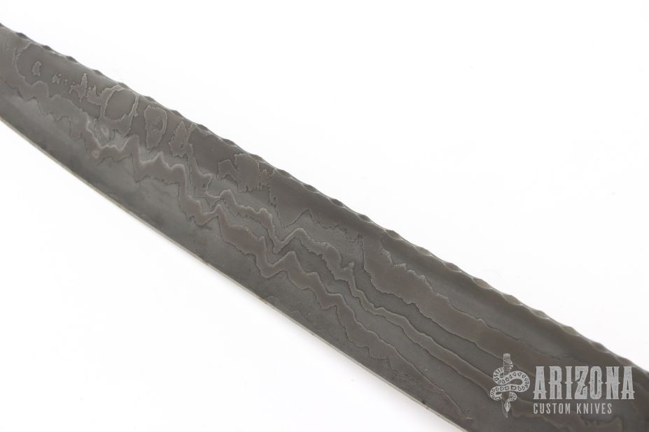 This Custom Knife by Half Face Blades features a Damascus blade with textured spine, .079" blade stock and 1.412" blade depth, full tang construction.  The handle has giraffe bone bolsters, curly koa wood scales with black liners, black/white/stone spacers. Excellent condition.