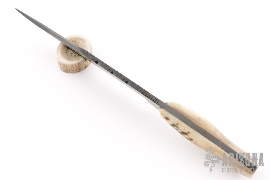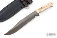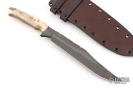 This Bowie by Barry Dawson features a clip point blade with a nice hamon, false top edge, fileworked blade spine, and a notched thumbrest, .252" blade stock and 1.641" blade depth, full tang construction. The handle has sheep horn scales with mosaic pins. Comes with a brown leather and kydex sheath. Excellent condition. Dated 2019 and #2