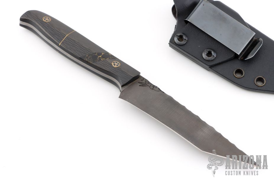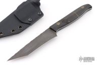 This Tanto by Half Face Blades features a dark stonewashed blade with textured spine and full tang construction, .113" blade stock and 1.135" blade depth.  The handle carbon fiber scales with black liners, brass and stone spacers, mosaic pins. Comes with a kydex sheath.  Has some sheath marks, otherwise excellent condition.