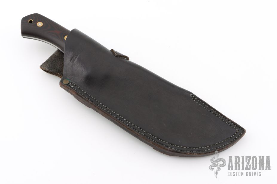 This is a WSK Tracker made by Dave Beck. It features a mirror finished blade with self-cleaning sawteeth on blade spine. Red/black linen micarta scales. Full tapered tang construction with .248" blade stock and 2.473" blade depth. Includes original Dave Beck black leather sheath. Tracker is stamped "BECK" on ricasso. Has some small oxidation spots on the blade, otherwise excellent condition.
