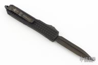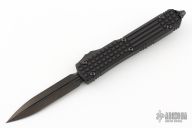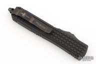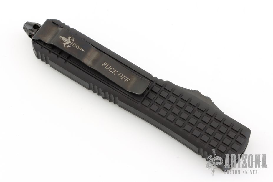 This Ultratech OTF automatic by Microtech features a D/E black DLC blade with fullers. Black aluminum frag pattern frame with black tip down stainless steel clip. Has "FUCK OFF" on the clip.  Includes original box and papers. Excellent condition.