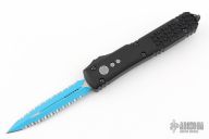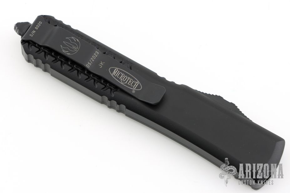 This Ultratech OTF automatic by Microtech features a D/E blue blade with a double fully serrated blade. Black aluminum contoured frame with tip down stainless steel clip. Dated 05/2023 and s/n 8020. Includes original box and papers. Excellent condition.