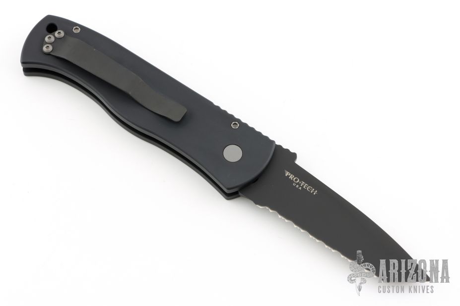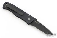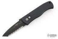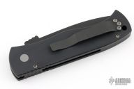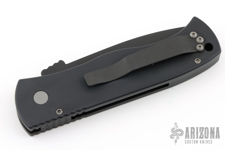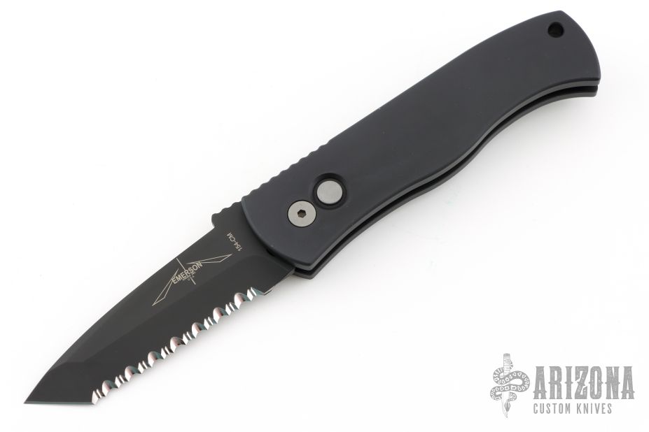 This Emerson/Pro-Tech CQC7 automatic has a chisel ground black DLC finished blade with a fully serrated edge put on by REK Knives, and a solid black aluminum handle. Coil spring. Excellent condition. Comes with original box and papers.