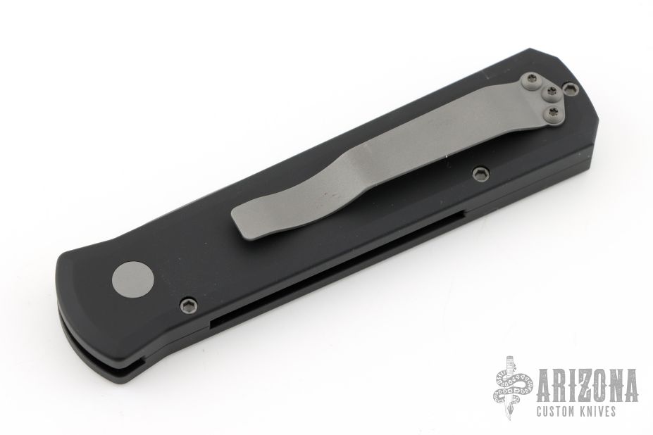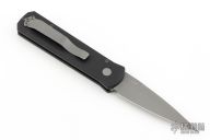 This 720 Godson from Pro-Tech Knives features a bead blasted blade with swedge. The handle has a black aluminum frame with bead blasted button, pivot and tip up clip. Comes with original box and papers. Excellent condition.