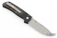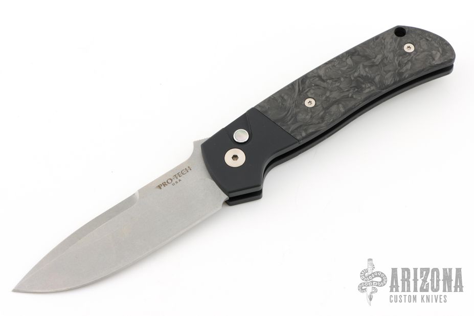 This ATCF Auto by Pro-Tech features a stonewashed Magnacut blade with notched thumbrest. The handle has a black aluminum frame with Dark Matter carbon fiber scales, tip up milled titanium clip with hidden screws. Comes with original box, pouch and papers. Excellent condition.