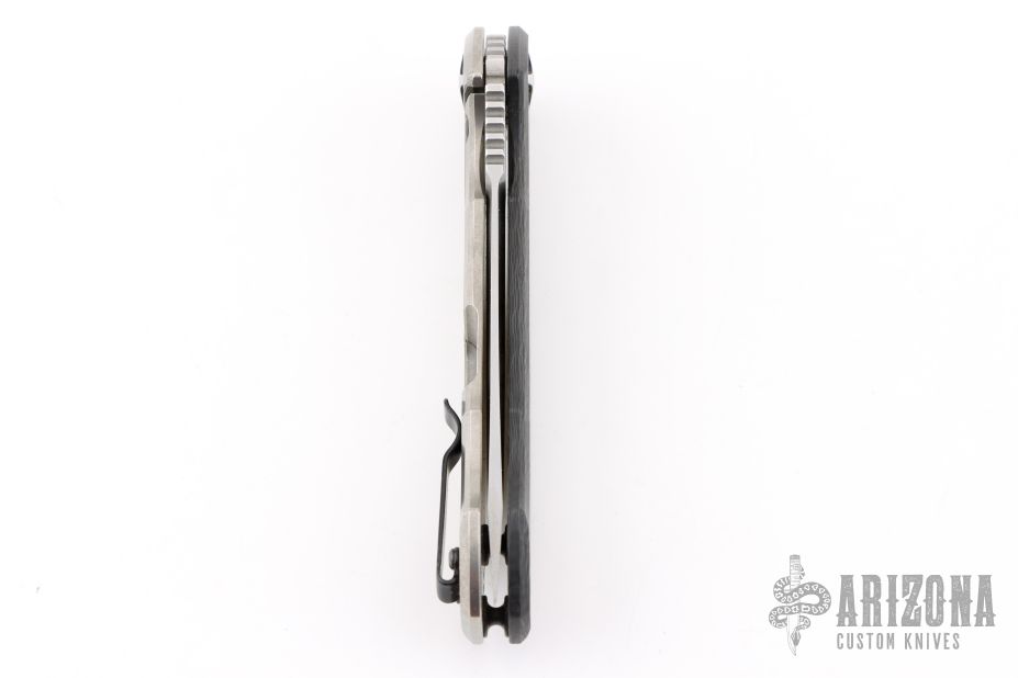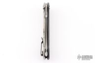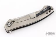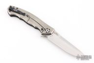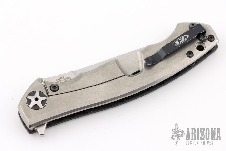 This 0452CF Sinkevich designed folder from Zero Tolerance features a drop point blade with swedge. The blade has tumble finished flats and satin grinds. The handle has a carbon fiber scale on the non lock side, and a tumbled finish titanium frame lock on the other. Serial #14230. Comes with original box and papers. Has some minor wear on the clip, excellent condition otherwise.