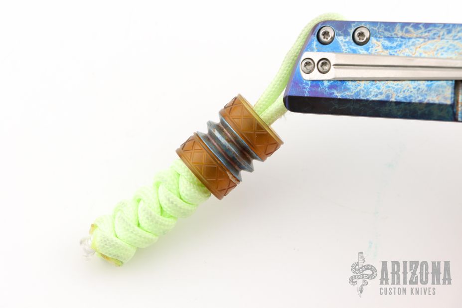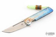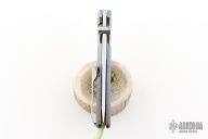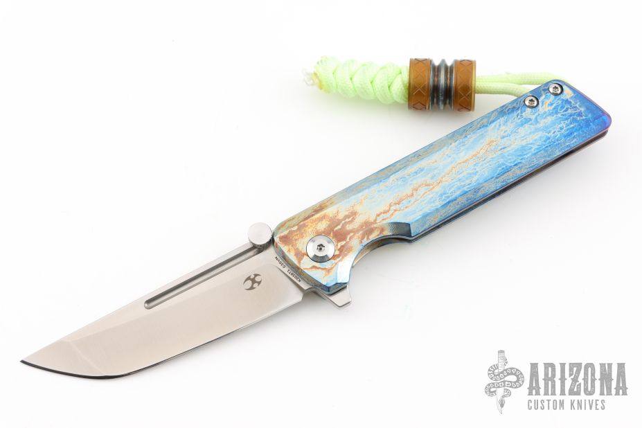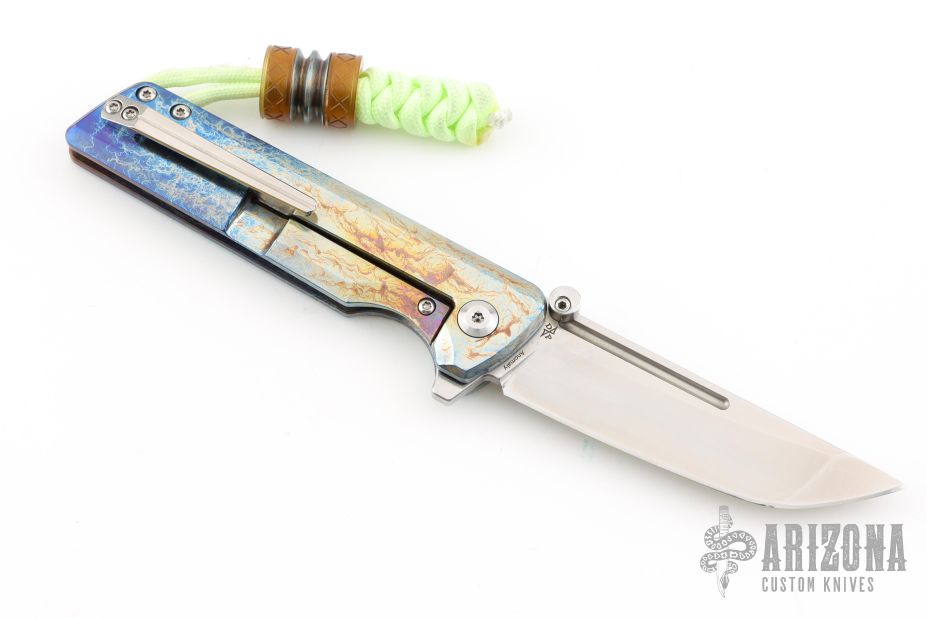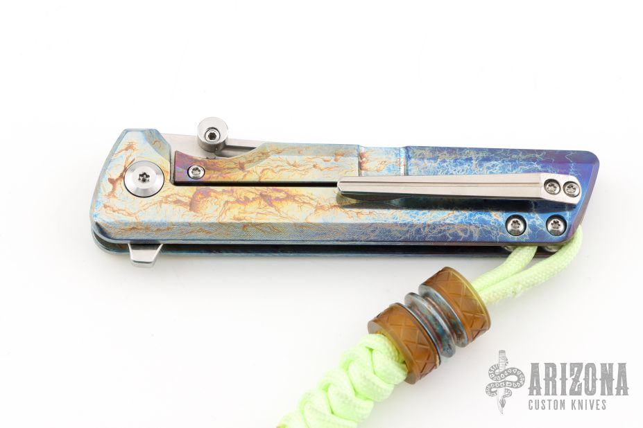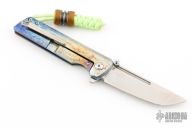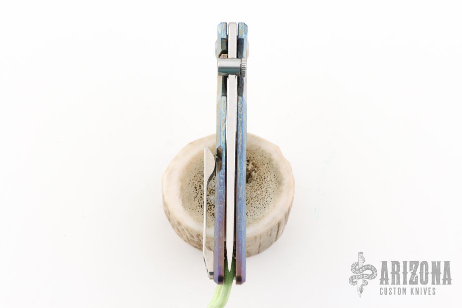 This knife features a satin finished blade with an adjustable thumbstud. The handle has aftermarket anodized titanium frame with a titanium pocket clip. Comes with original box, papers, and pouch. Excellent condition.